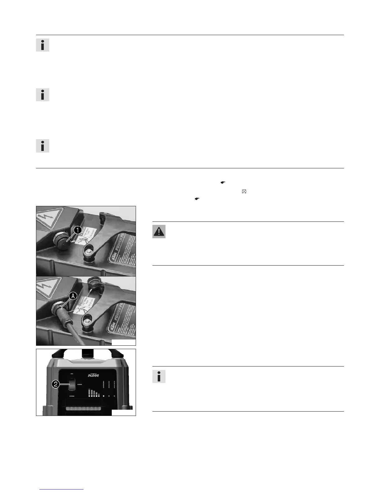 When the battery charger is connected to the KTM PowerPack, do not activate the vehicle.