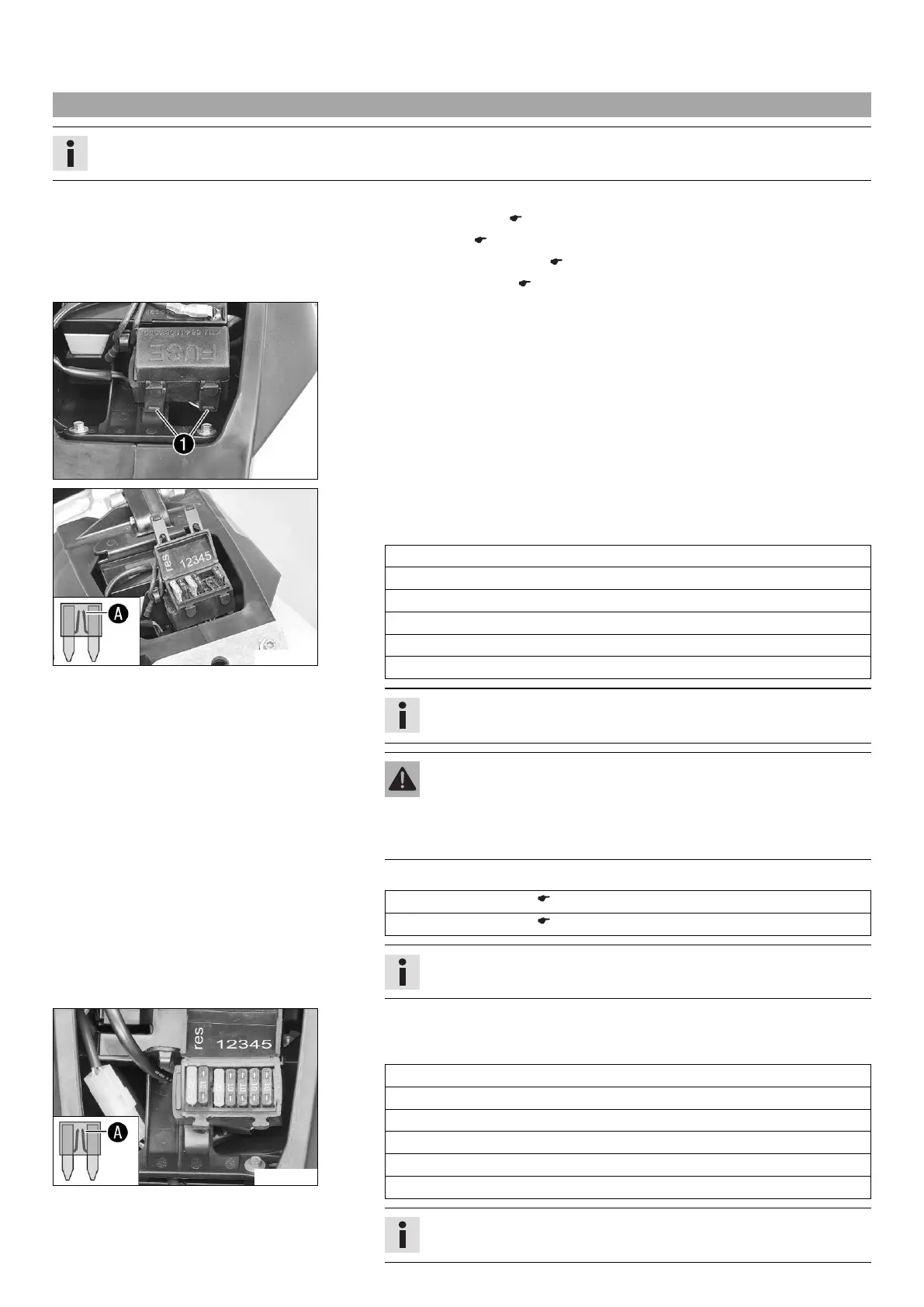 The fuse box containing the fuses for the individual power consumers is located under the seat, behind the 12 V battery.