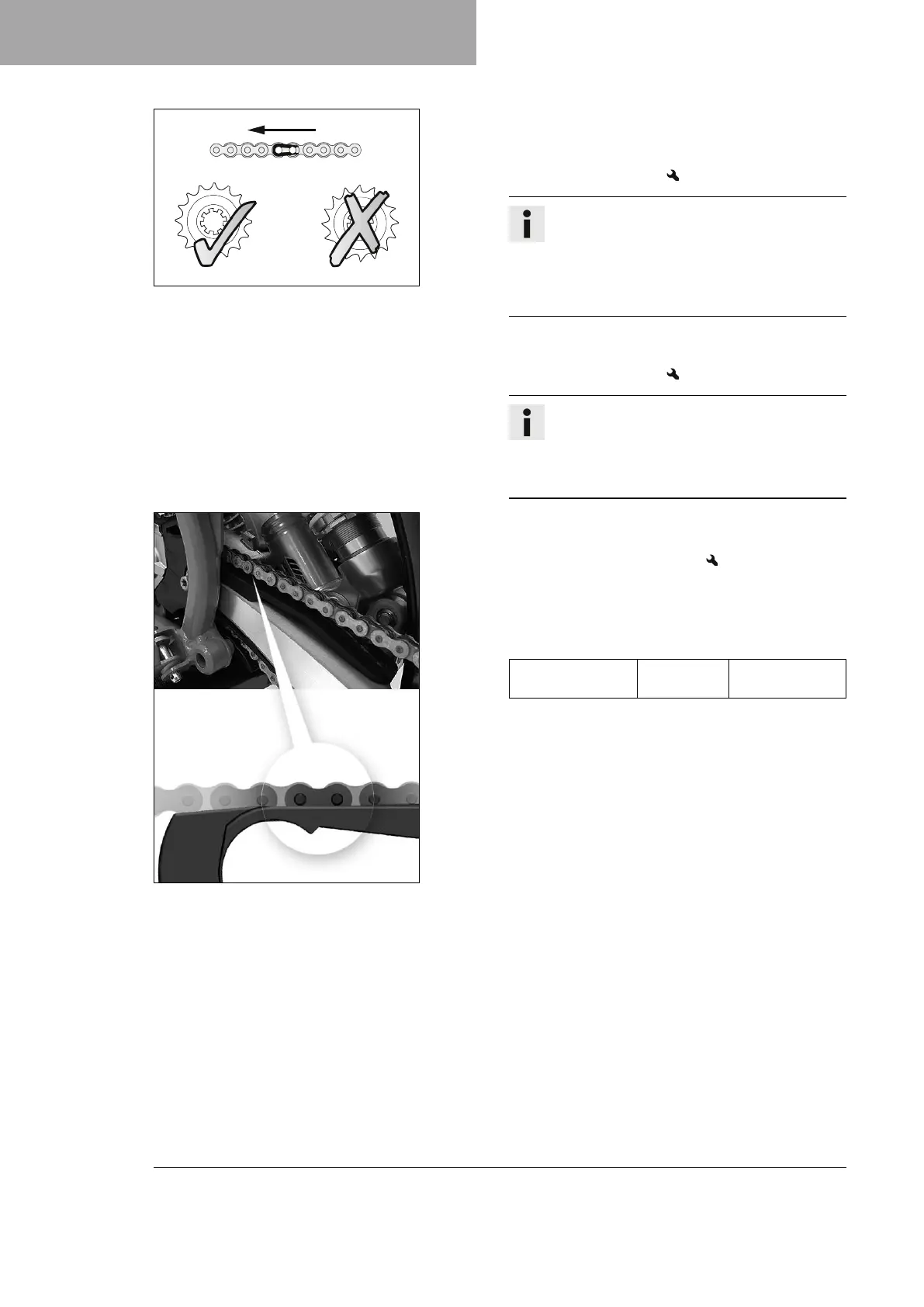 – Check the chain, rear sprocket, and motor sprocket for wear.