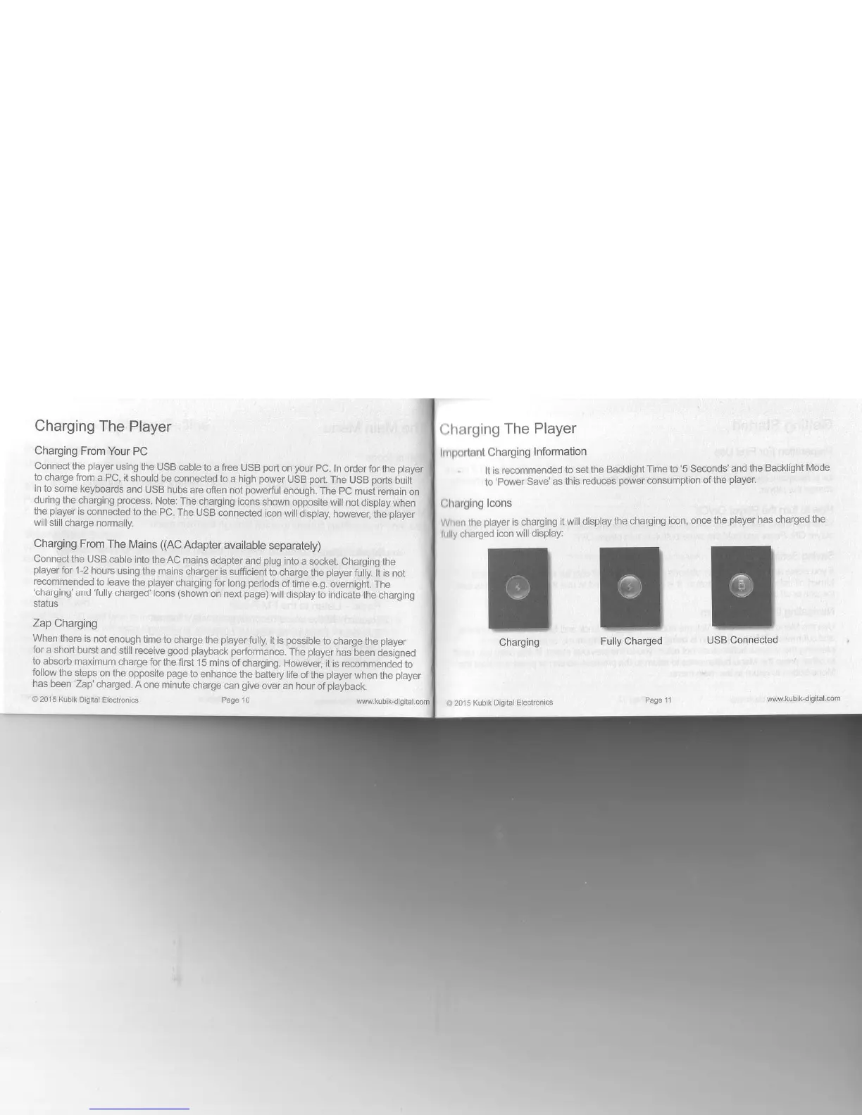 kubik Evo - Charging the Player; Charging from Your Pc;The Mains; Zap Charging; Charging Icon