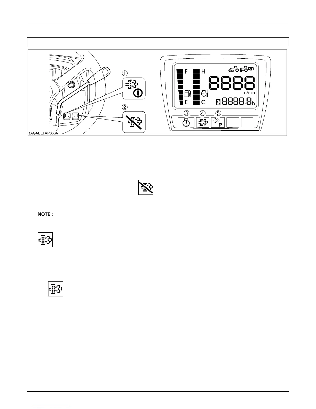 2. When a specific amount of PM has built up in the DPF, the regeneration indicator turns "ON".