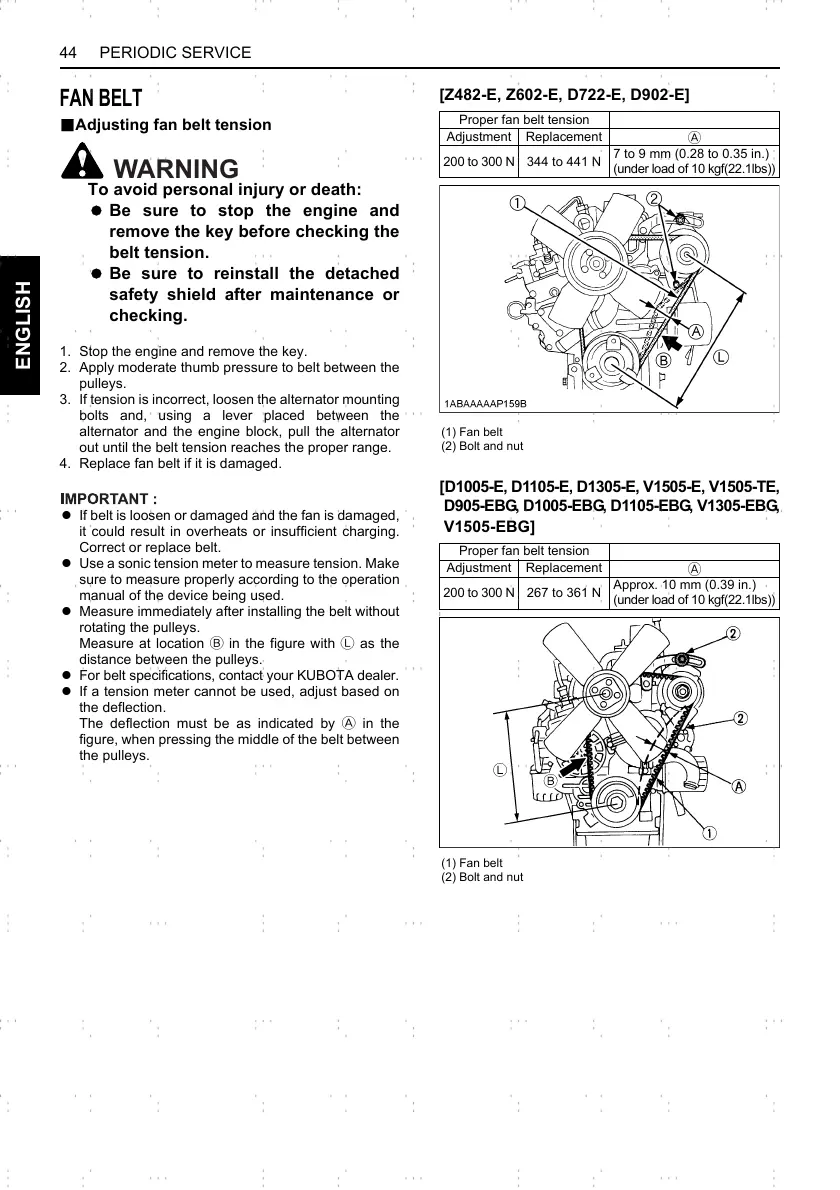 A For belt specifications, contact your KUBOTA dealer.