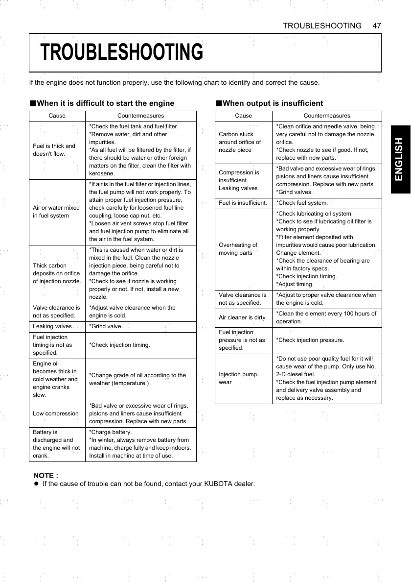 A If the cause of trouble can not be found, contact your KUBOTA dealer.