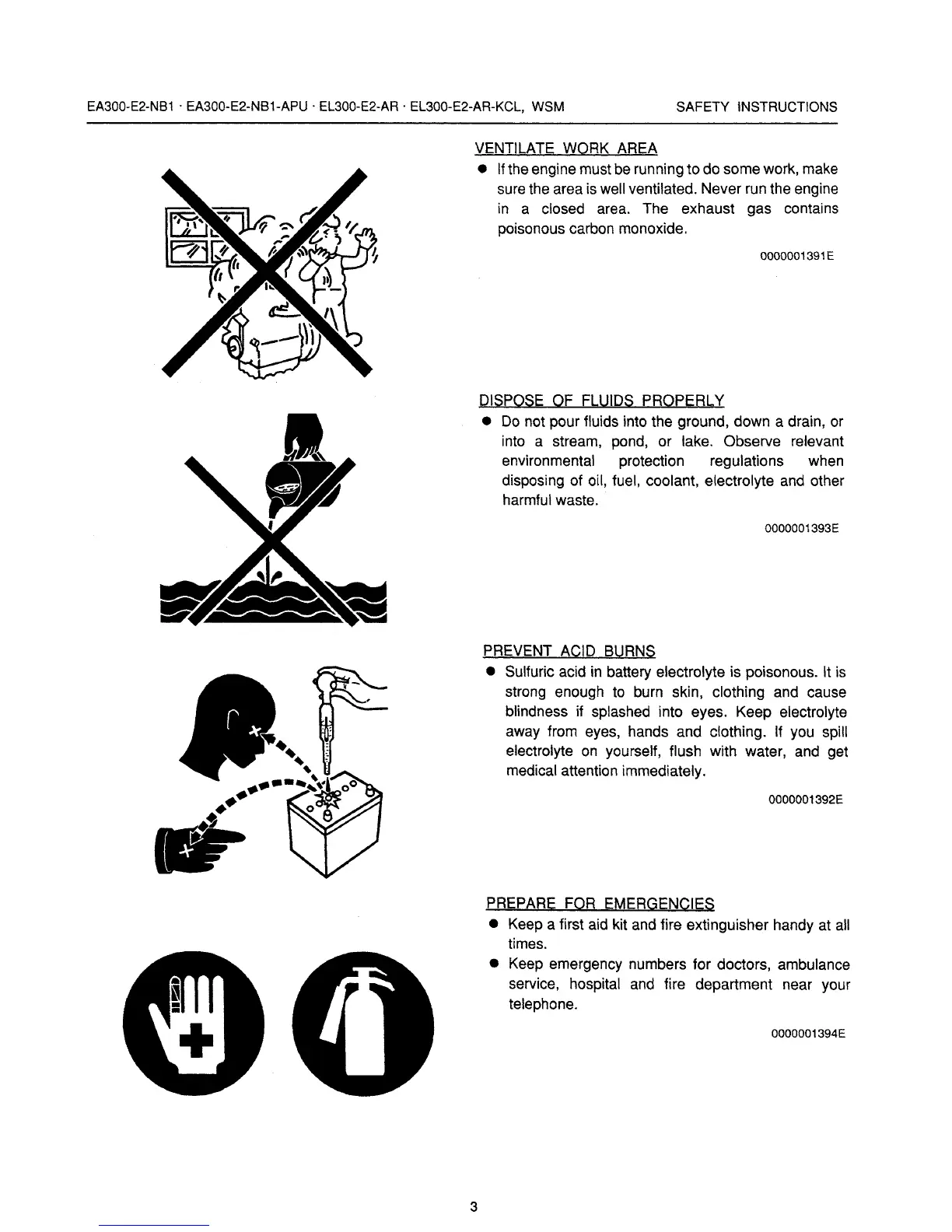 Kubota EA300-E2-NB1 - Ventilation for Exhaust Gas Safety; Proper Fluid Disposal Guidelines; Acid Burn Prevention; Emergency Preparedness Recommendations