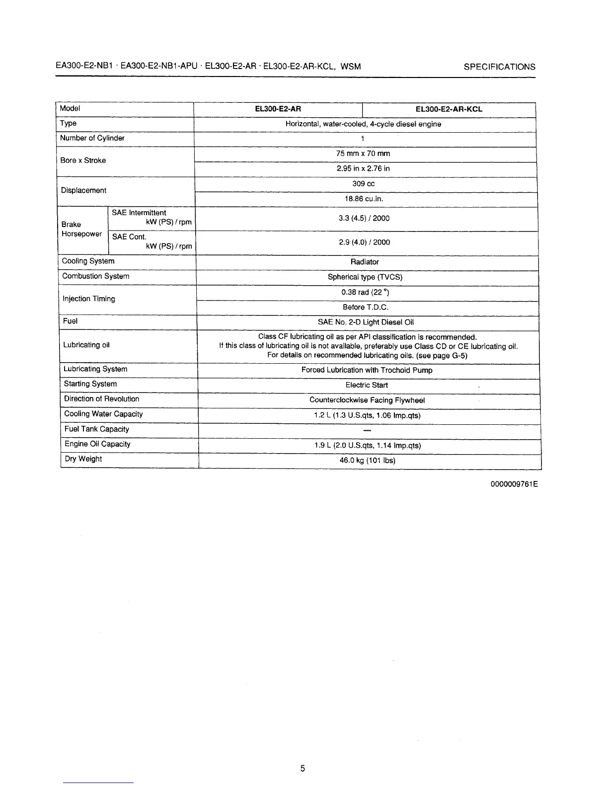 Kubota EA300-E2-NB1 - EL300-E2-AR Engine Specs; EL300-E2-AR-KCL Engine Specs