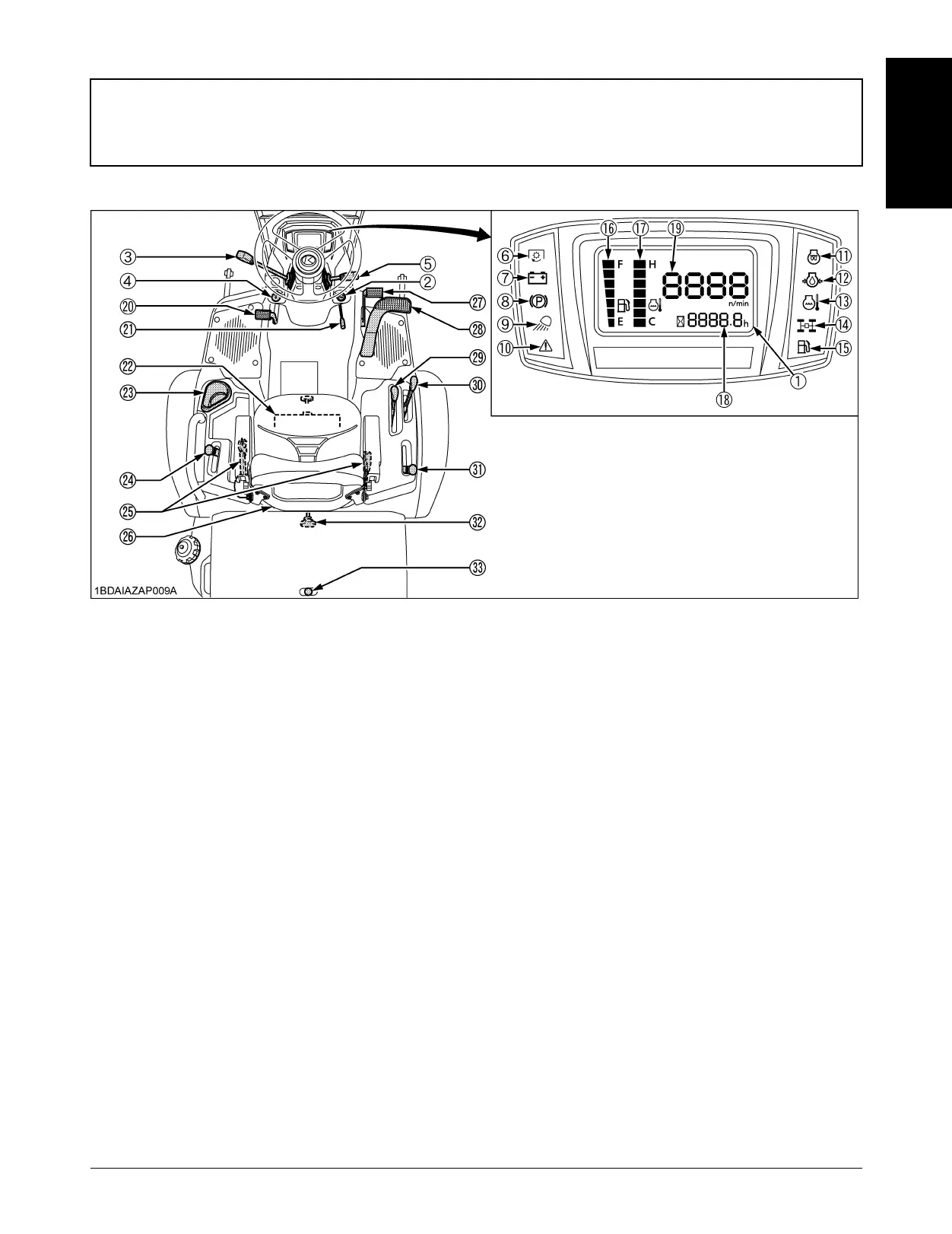 (9) Head light indicator................................................... 19 (26) Operator's seat..................................................... 18