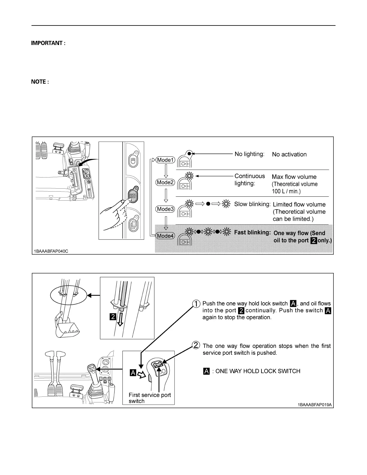 When the plugs on the service port lines are removed to connect attachments, drain approx. 100 cc (3.4 oz) of oil per