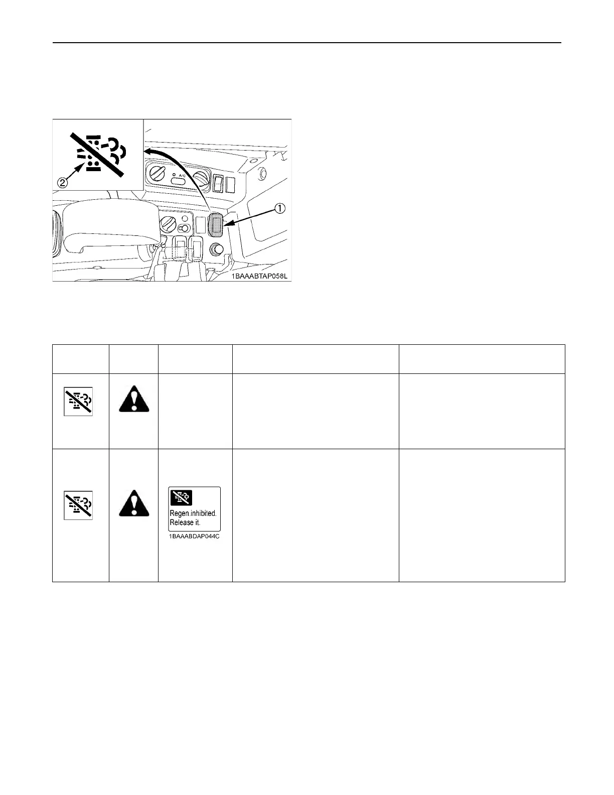The automatic DPF regeneration is locked and the indicator (2) in the switch lights up.