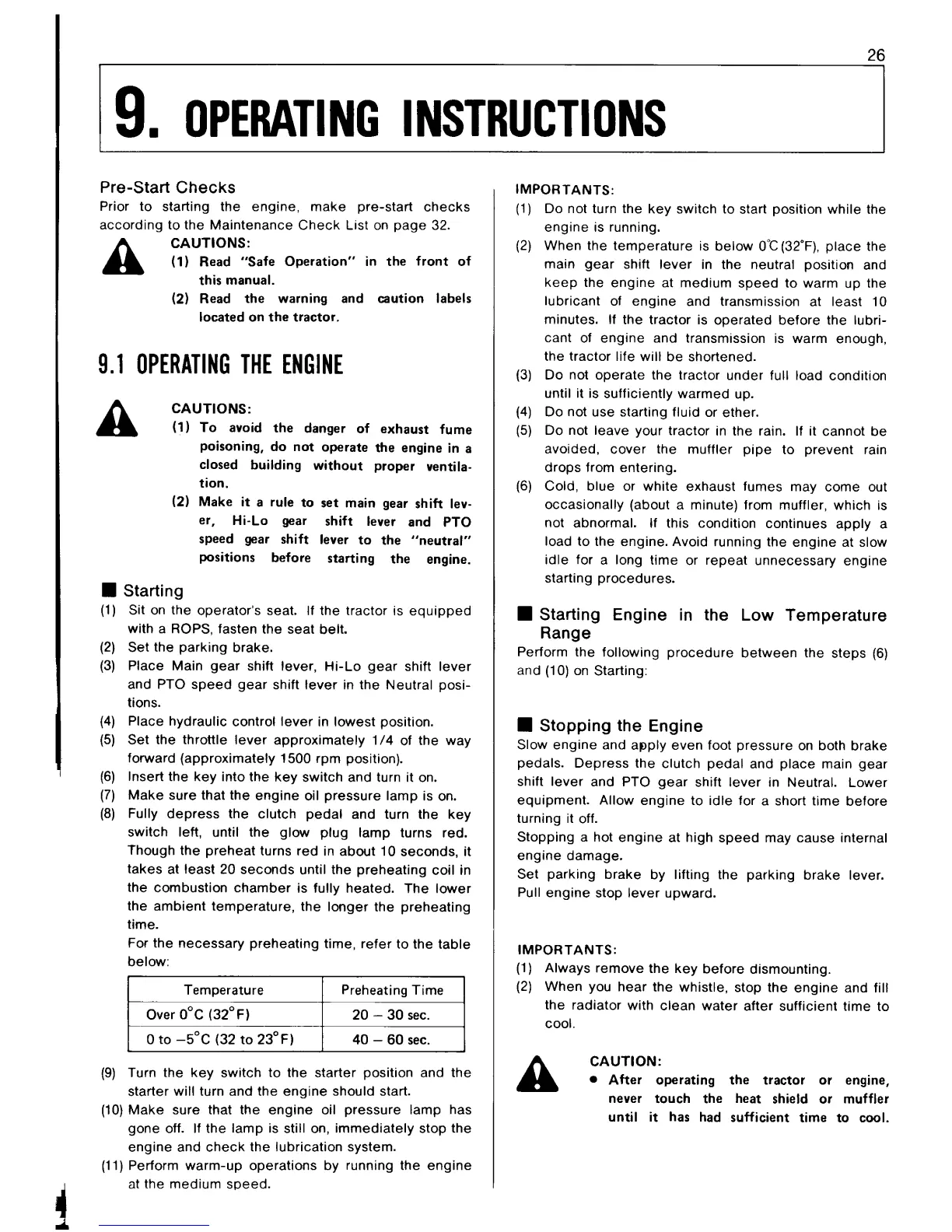 Kubota L2350 - 9. OPERATING INSTRUCTIONS; 9.1 OPERATING THE ENGINE