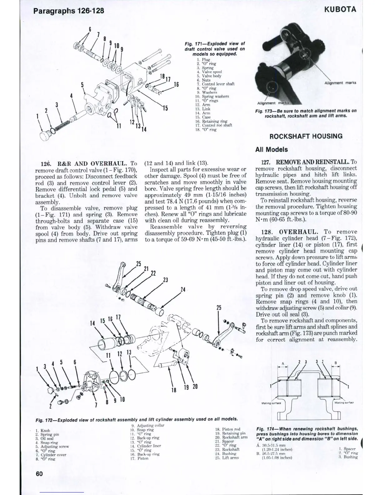 Fig. 172—Exploded view of rockshaft assembly and lift cylinder assembly used on all models.
