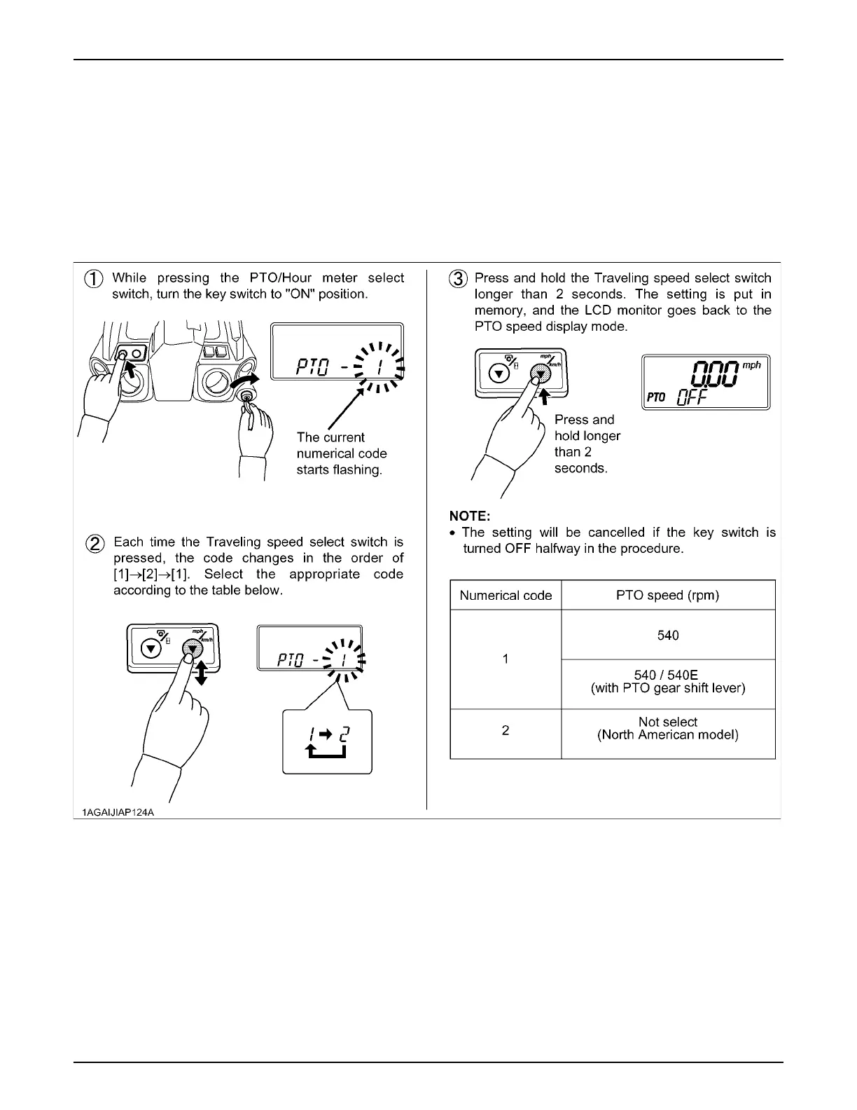 The PTO speed display mode has been factory-set at Code 1. Do not attempt to change the code. Otherwise the correct