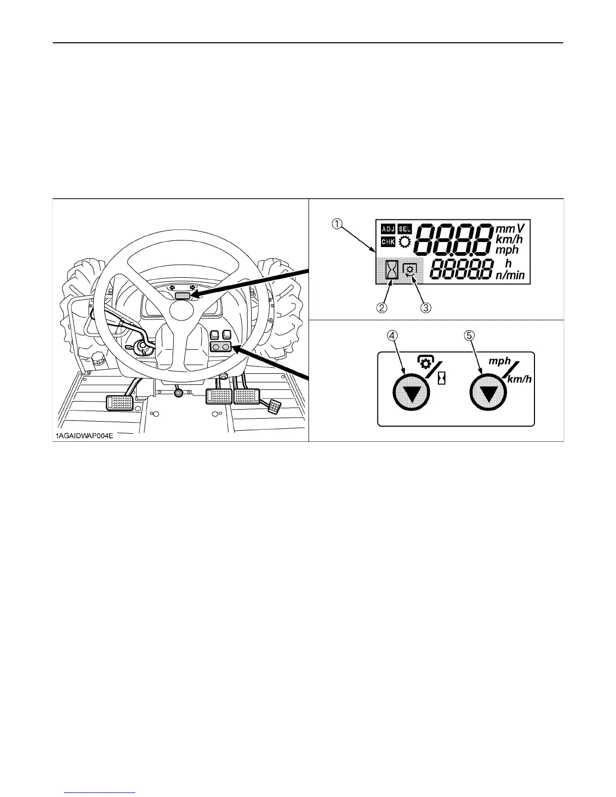 1) PTO clutch control lever ON: Traveling speed and PTO speed are displayed.