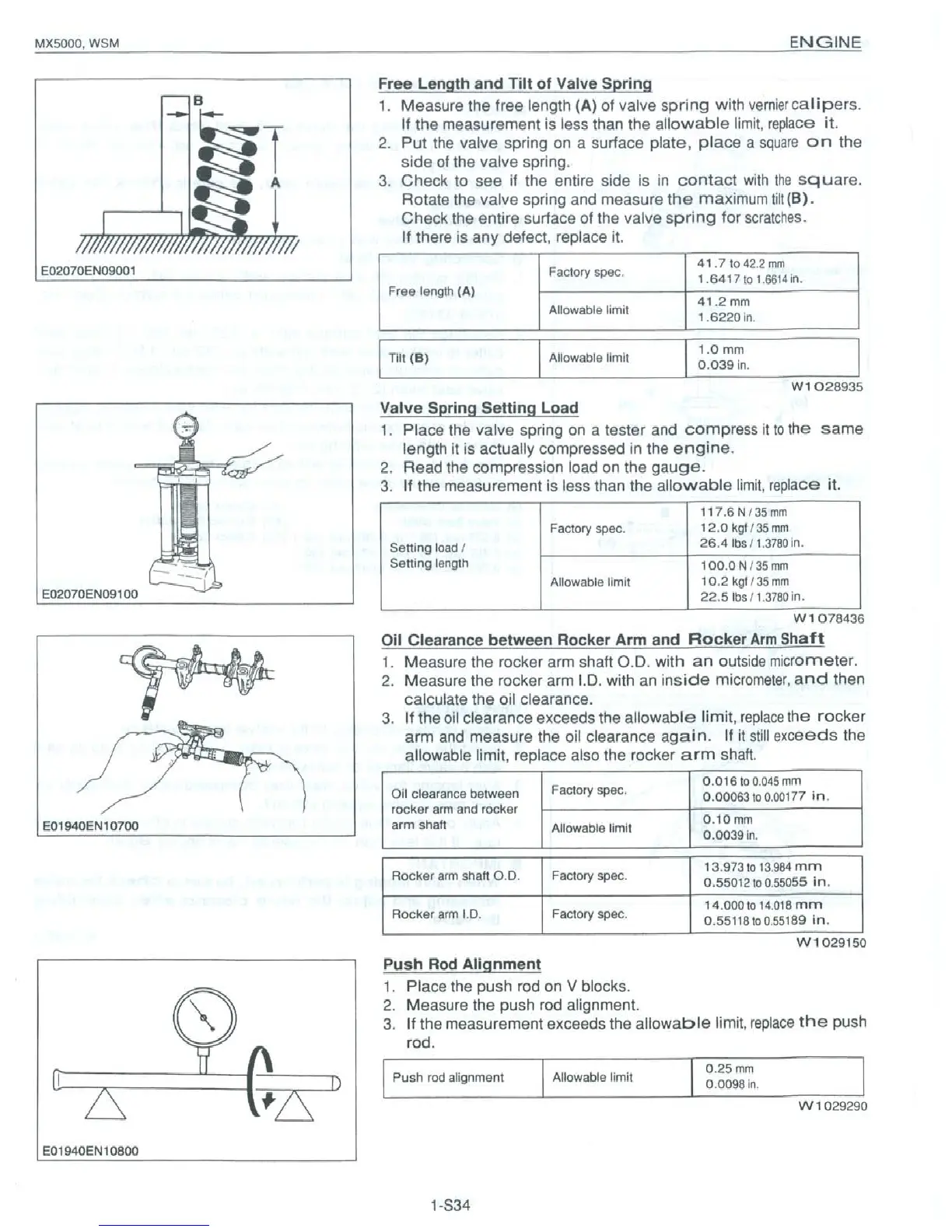 Kubota MX5000 - Free Length and Tilt of Valve Spring; Valve Spring Setting Load; Oil Clearance between Rocker Arm and Rocker Arm Shaft; Push Rod Alignment