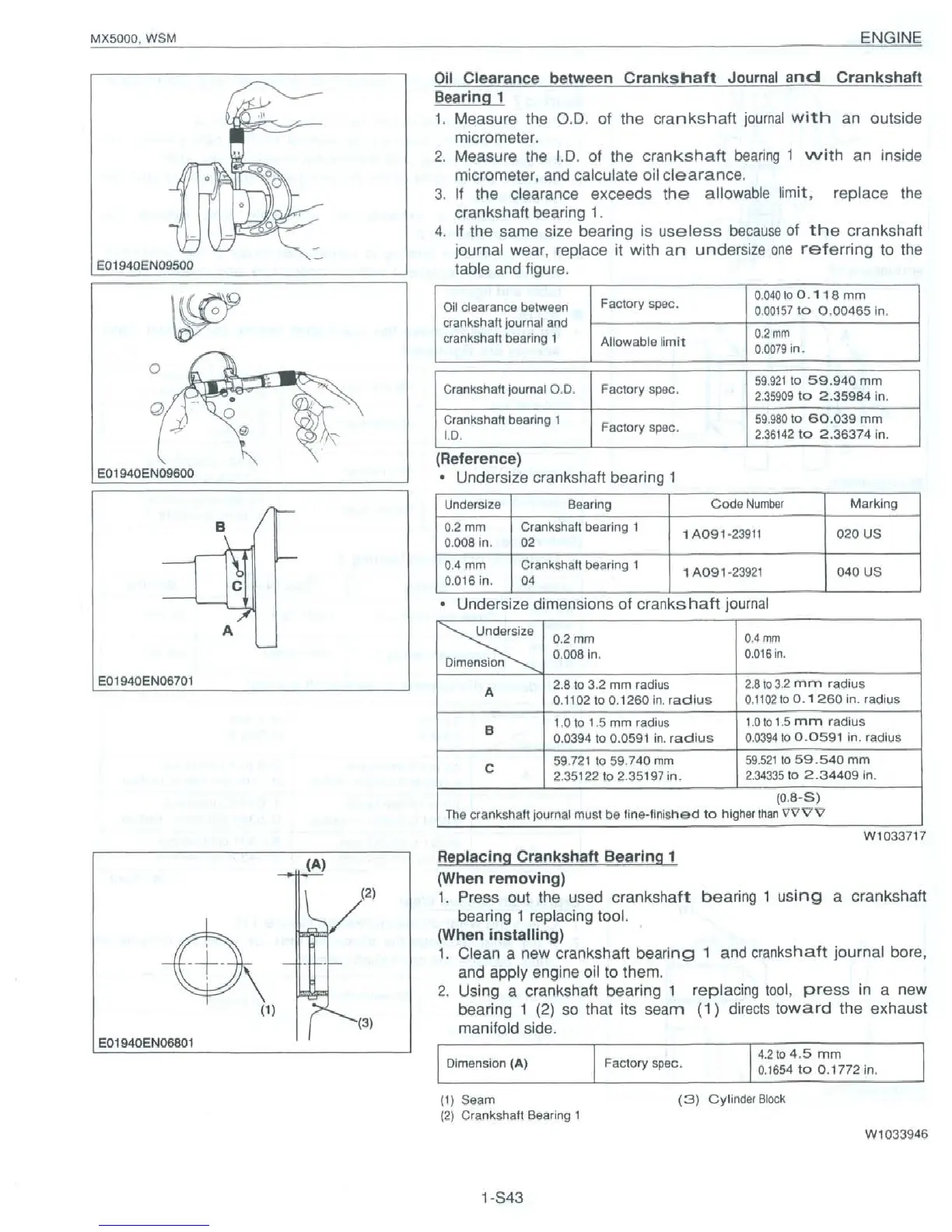 Kubota MX5000 - Oil Clearance between Crankshaft Journal and Crankshaft Bearing 1; Replacing Crankshaft Bearing 1