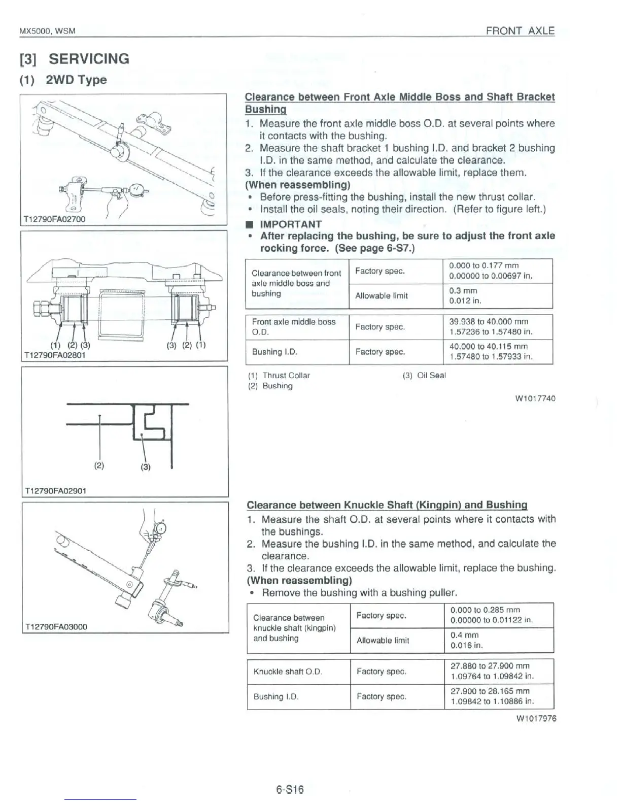 Kubota MX5000 - Clearance between Front Axle Middle Boss and Shaft Bracket Bushing; Clearance between Knuckle Shaft (Kingpin) and Bushing