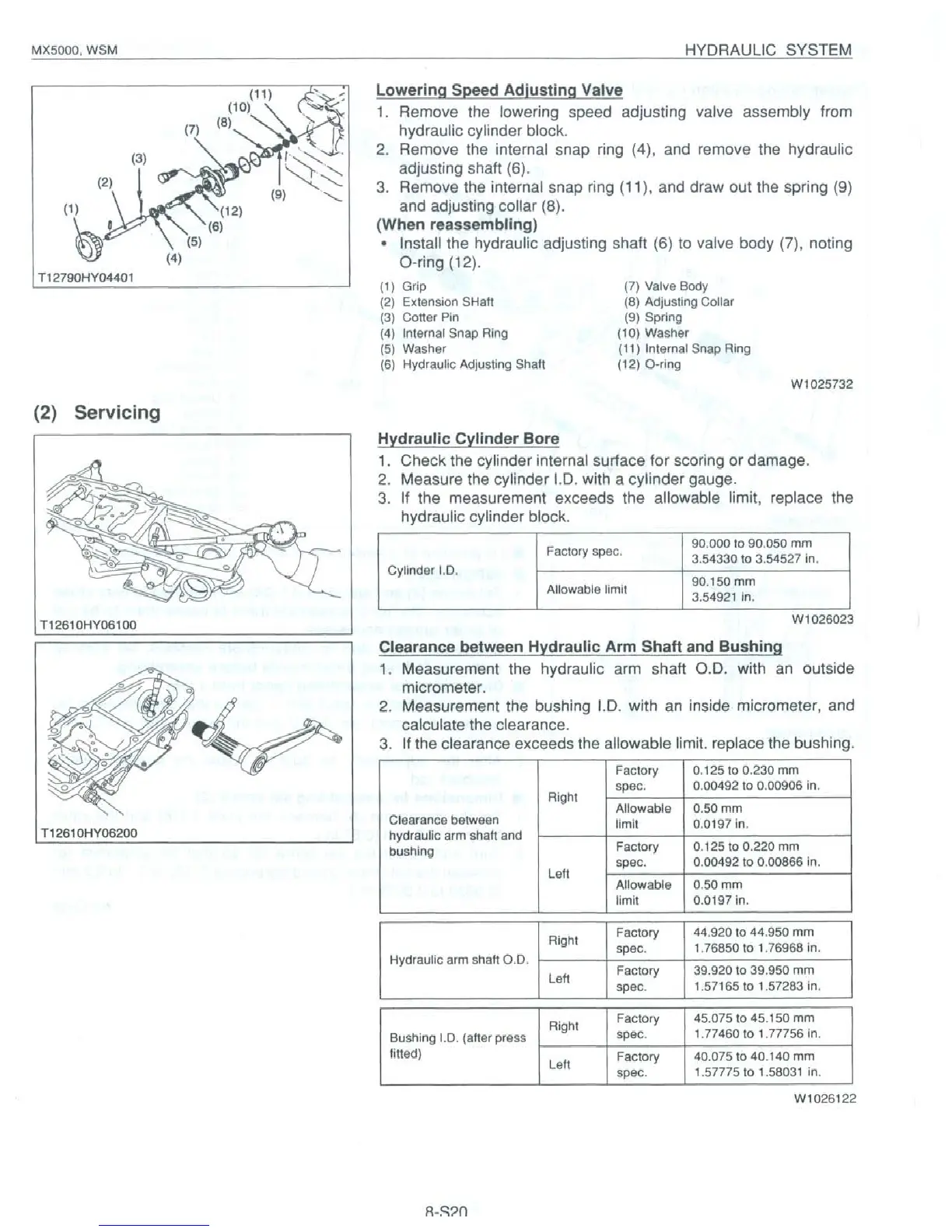 Kubota MX5000 - Lowering Speed Adjusting Valve; Hydraulic Cylinder Bore; Clearance between Hydraulic Arm Shaft and Bushing
