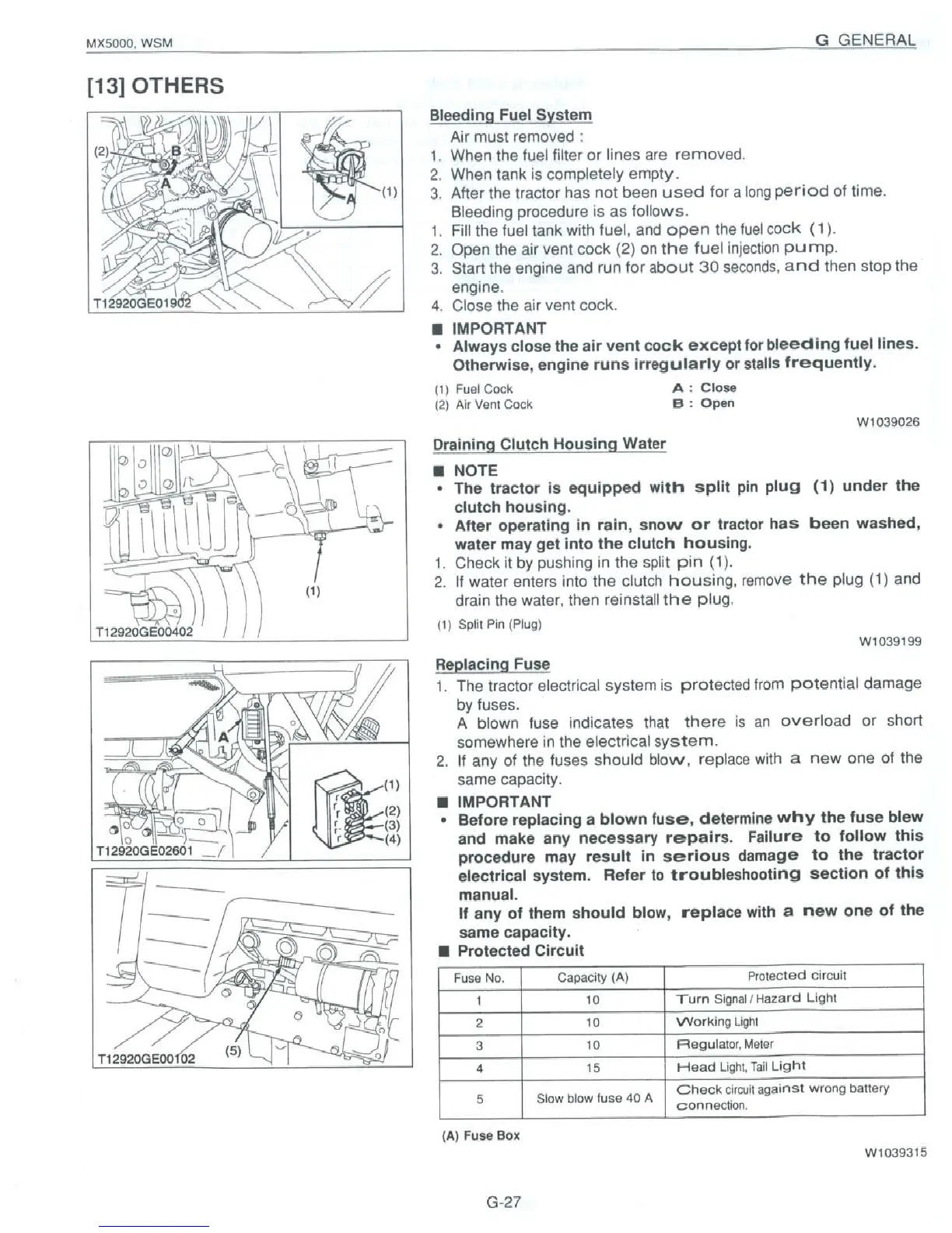 Kubota MX5000 - Bleeding Fuel System; Draining Clutch Housing Water; Replacing Fuse