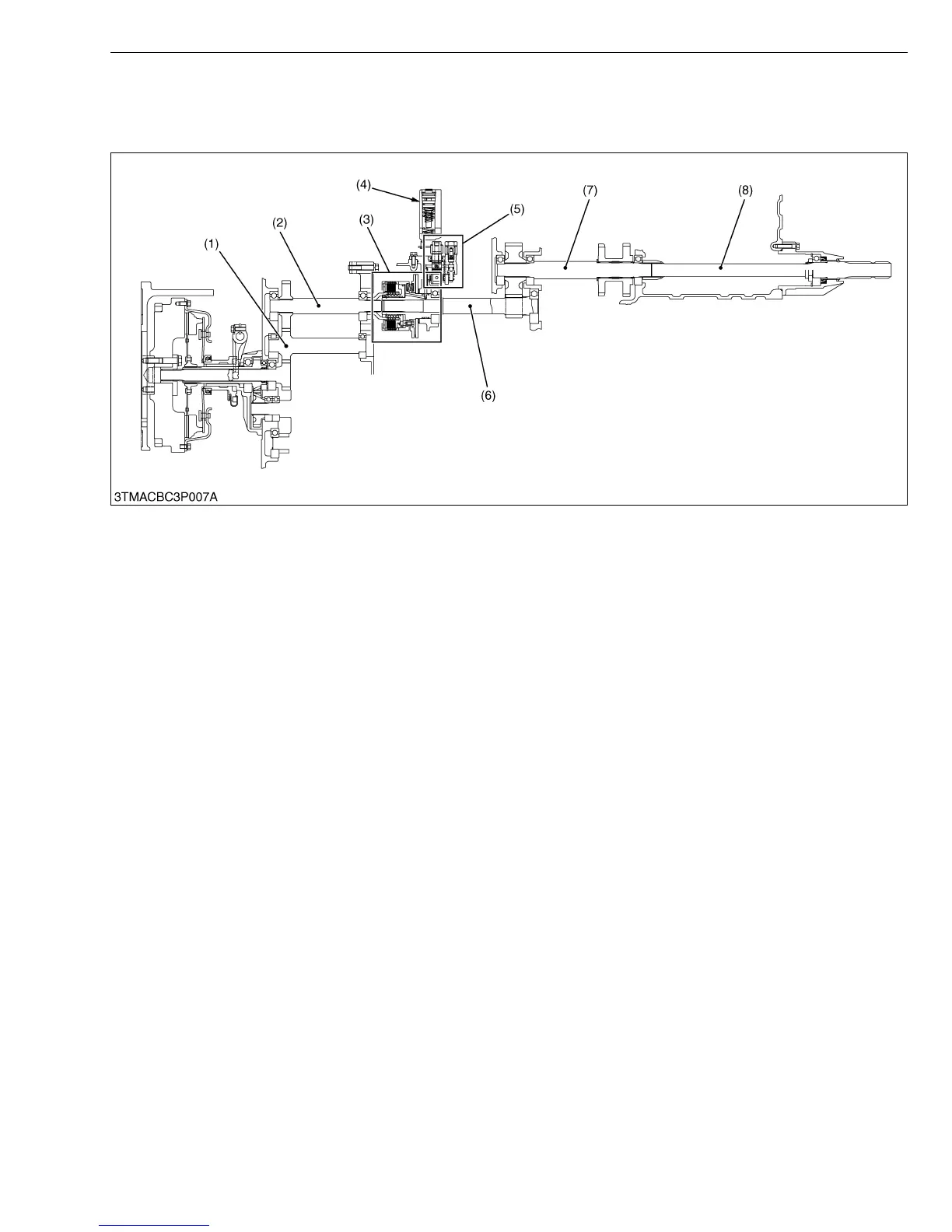 The PTO power train from the clutch to the rear PTO shaft is composed as shown in the figure above.