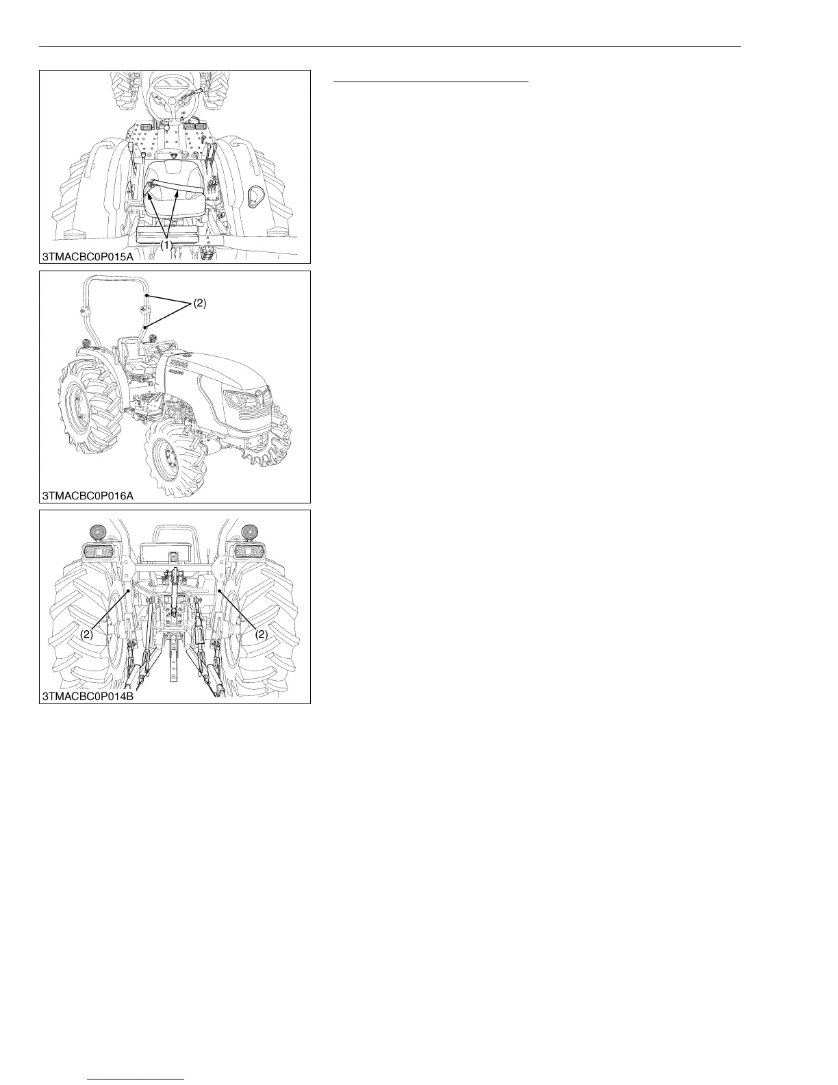 1. Always check condition of seat belt (1) and ROPS (2) attaching