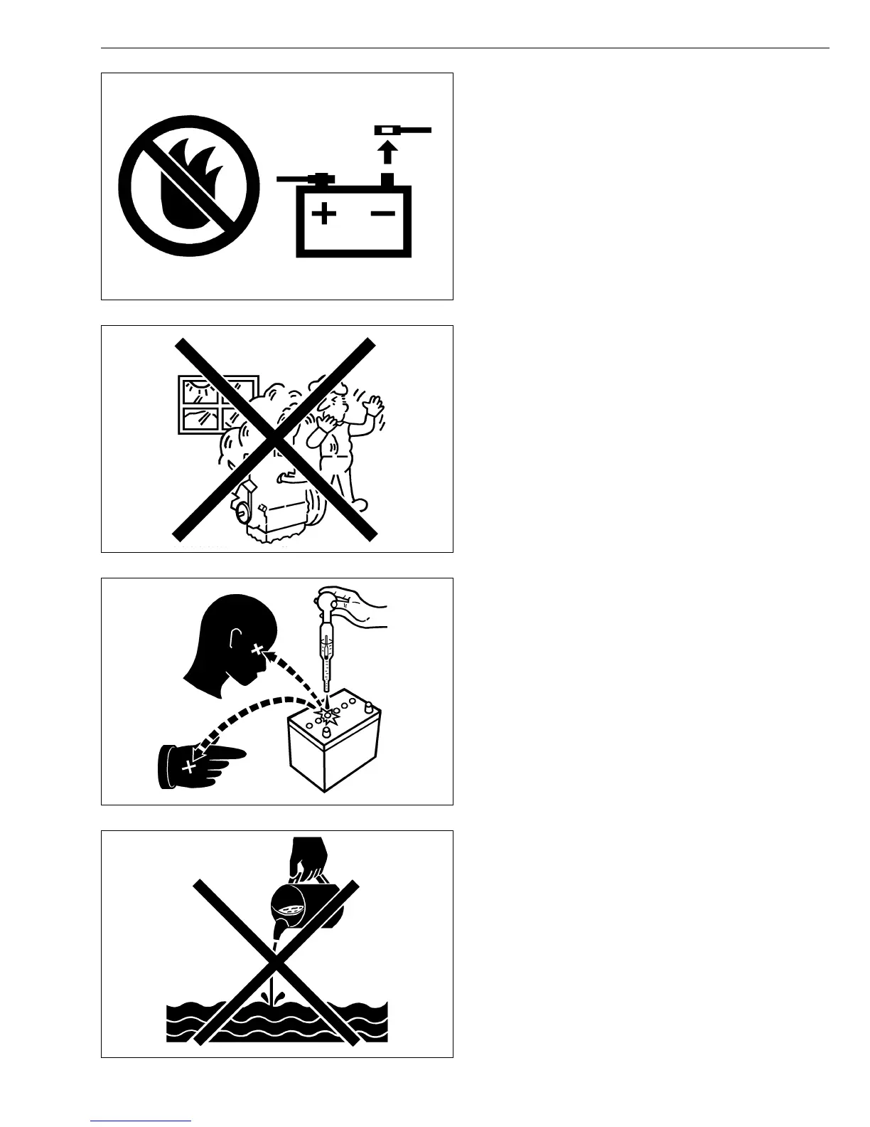 • Battery gas can explode. Keep sparks and open