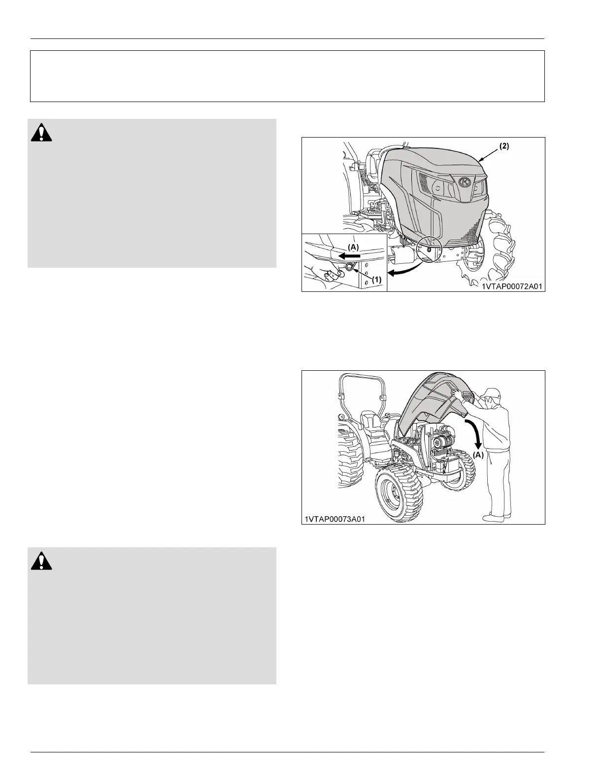 • Never open the hood or the engine side cover