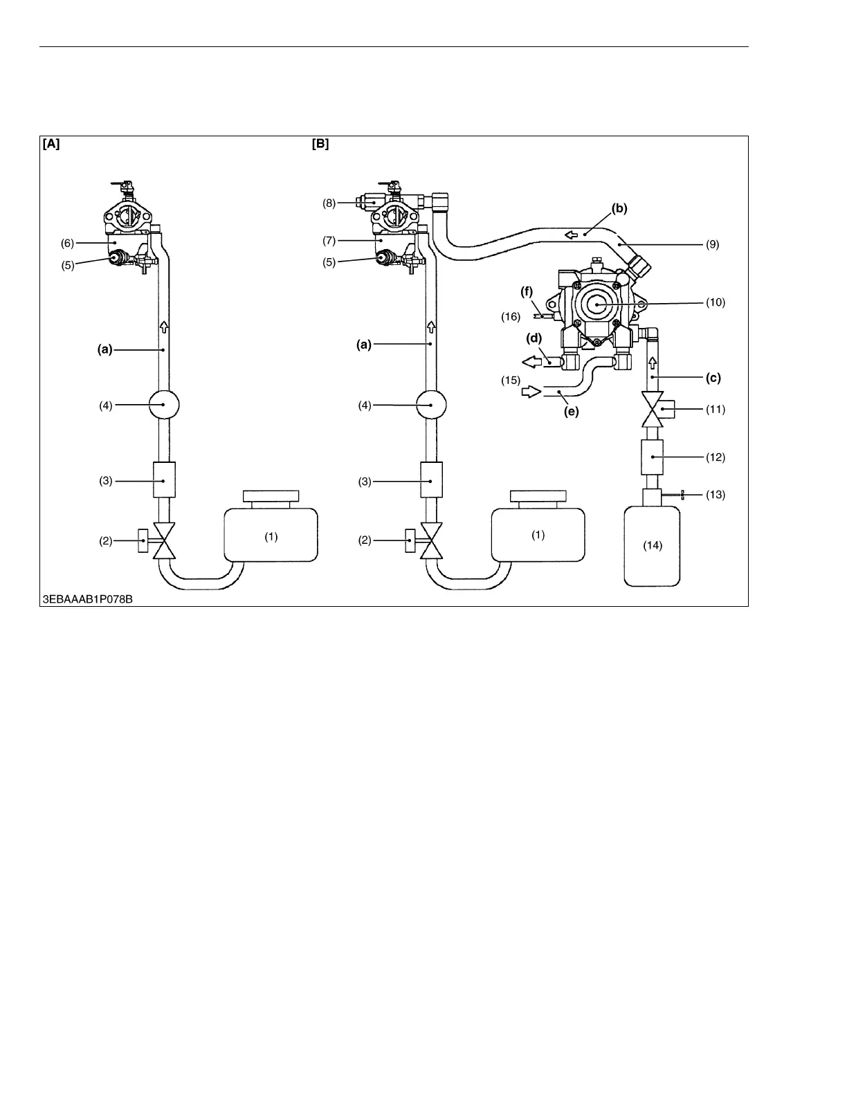The fuel is fed from the fuel tank (1) through the fuel filter (3) to the carburetor (6) by the fuel feed pump (4).