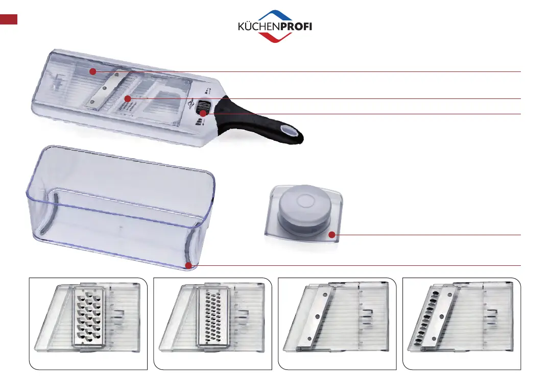Messereinsatz für grobe Raspel Messereinsatz für feine Raspel Messereinsatz für Scheiben Messereinsatz für Stifte