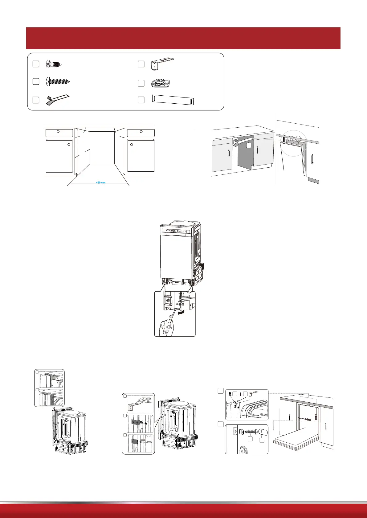 Level the dishwasher. The rear food can be adjusted from the front of the dishwasher by turning . To adjust the front feet, use
