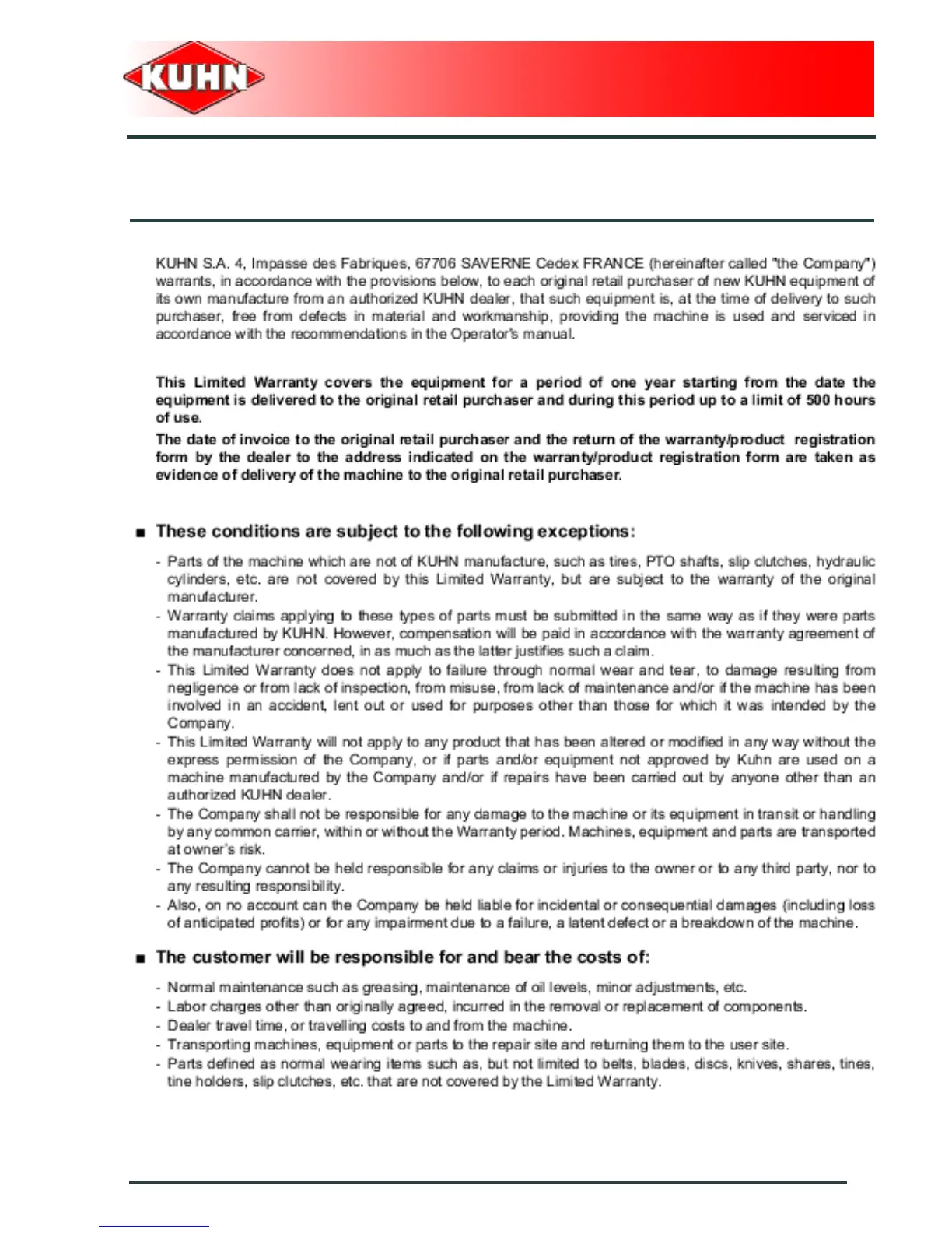KUHN EL32 - Limited Warranty