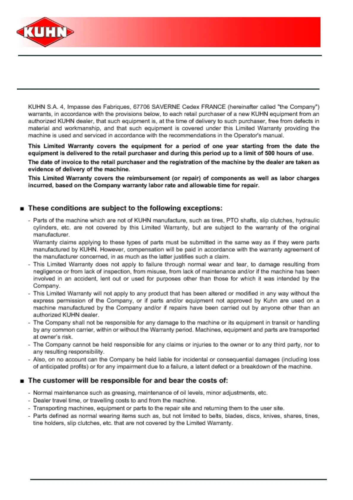 KUHN EL53 - Limited Warranty