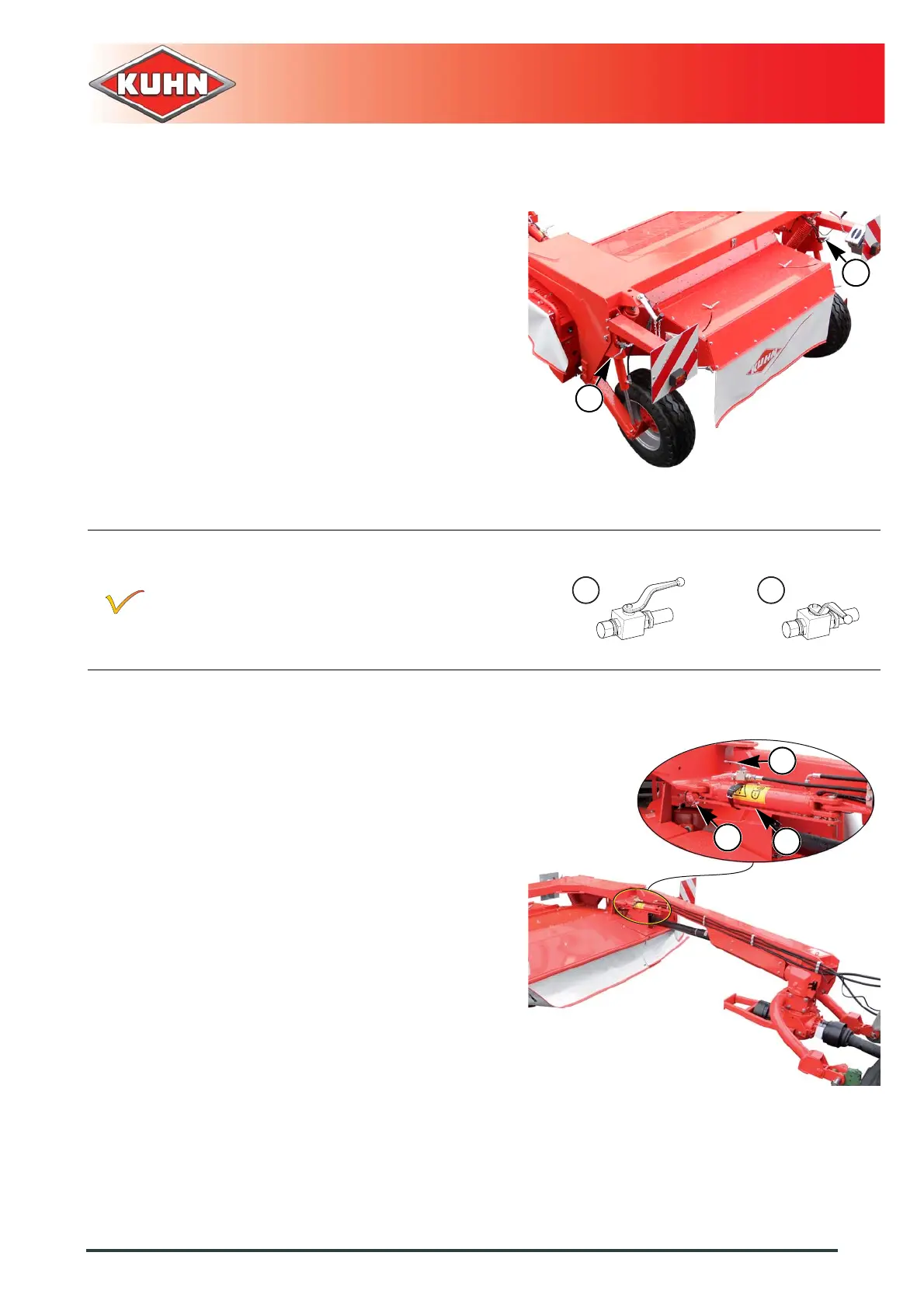 - Open the mowing unit lift cylinder lock valves (1).