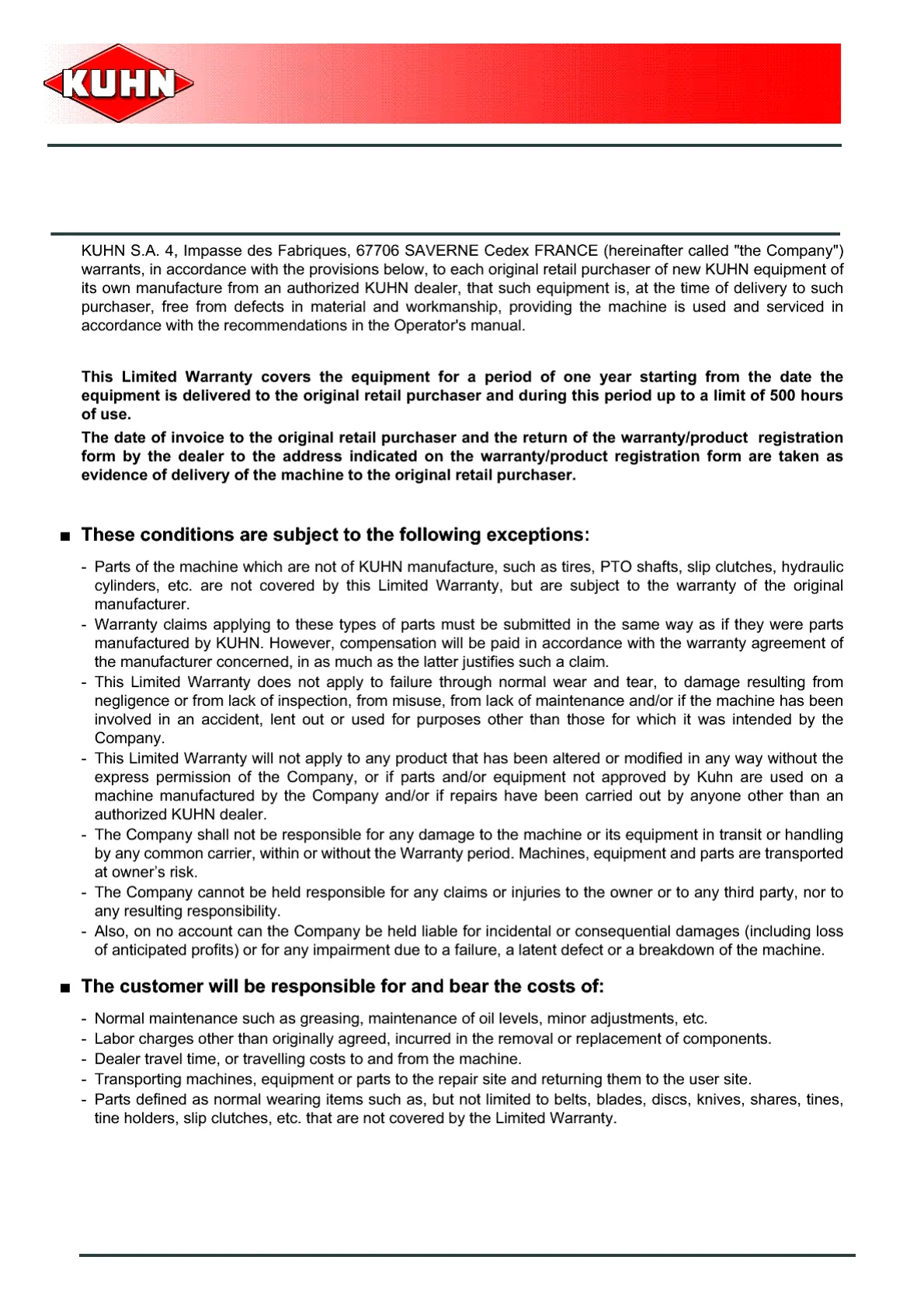 KUHN FC883RA - Limited Warranty