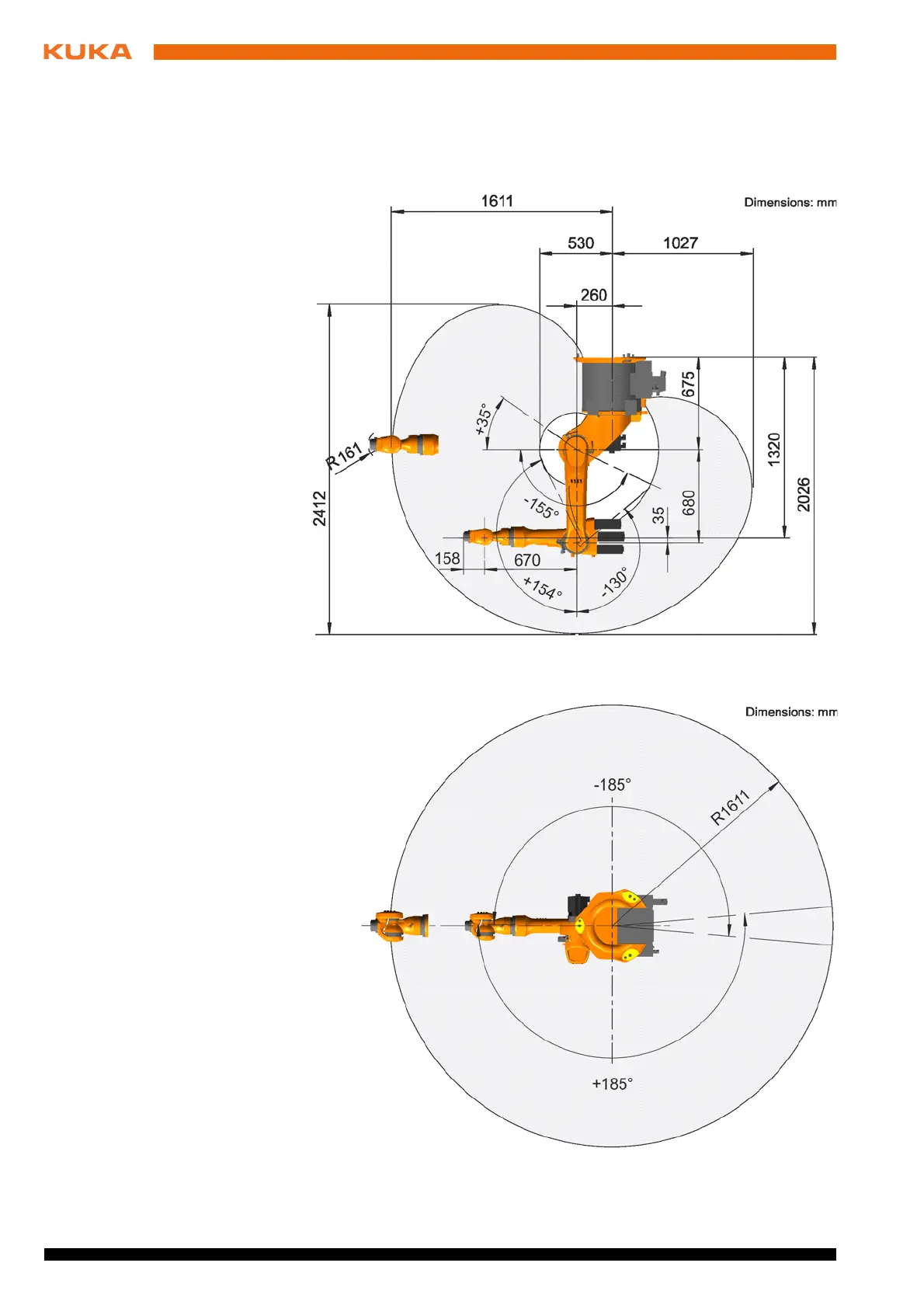 Fig. 4-10: Work envelope, top view, KR 20-3 C