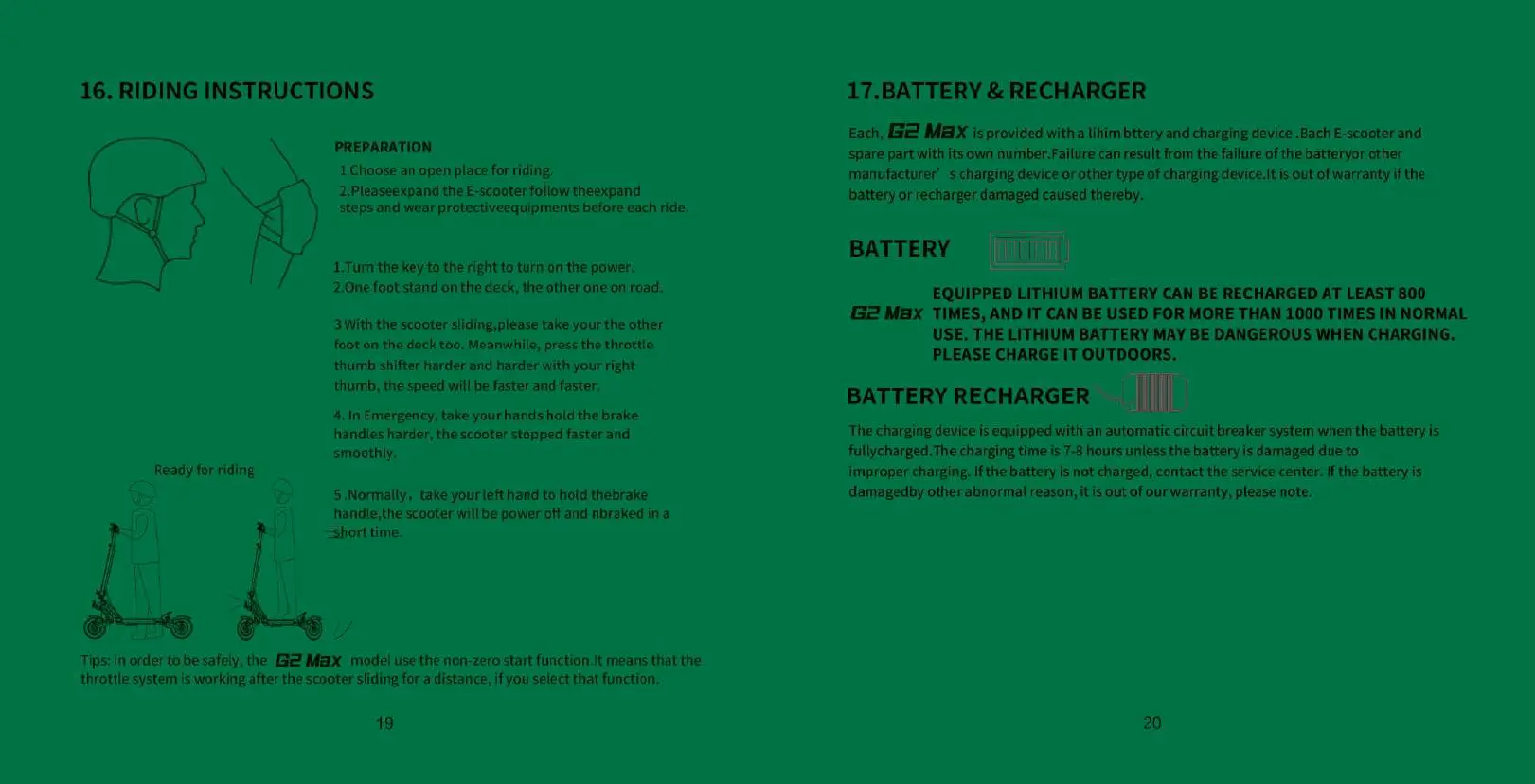 Kukirin G2 Max - Riding Instructions and Battery; Riding Procedures; Battery and Recharger Information