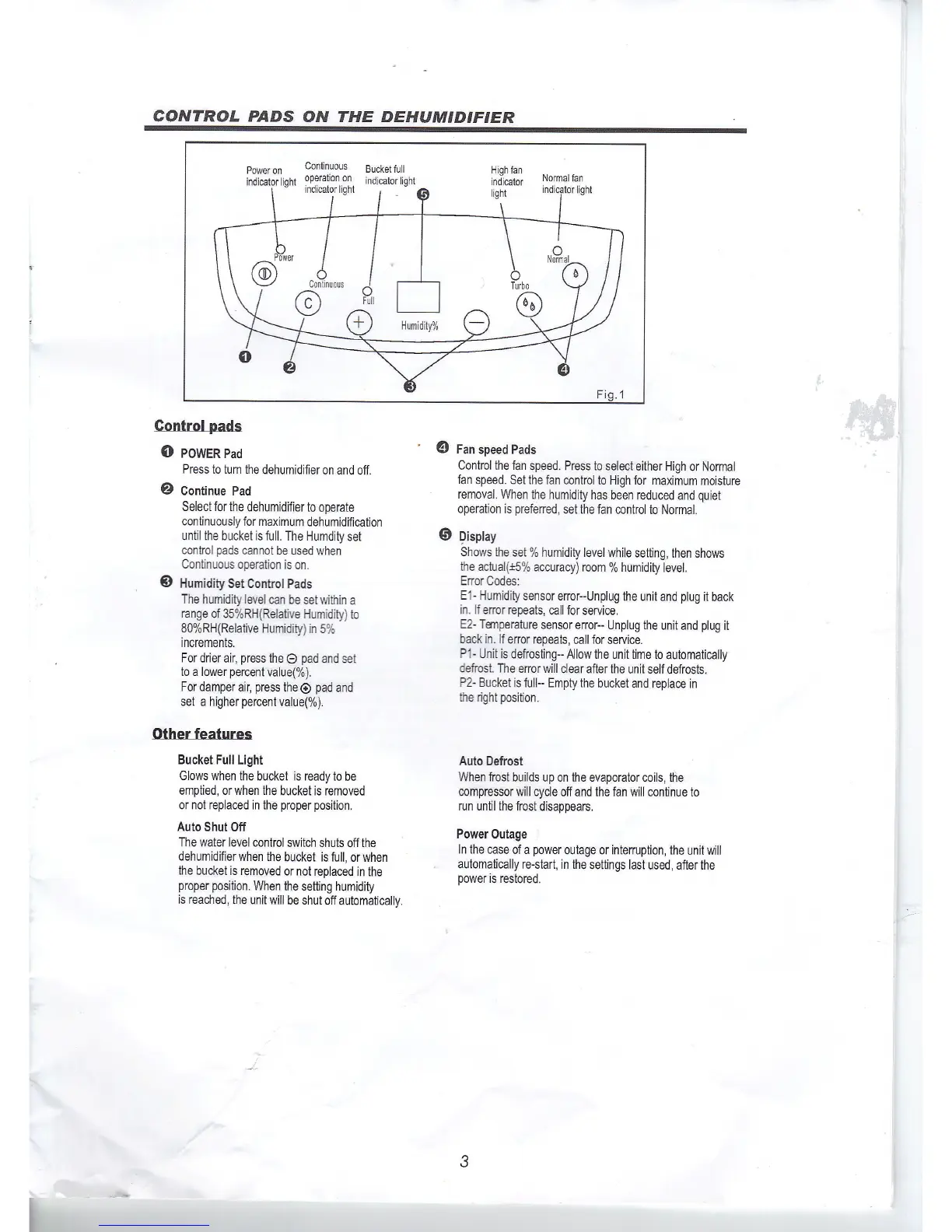 KUL KU34403 - CONTROL PADS ON THE DEHUMIDIFIER; Dehumidifier Control Pad Functions; Fan Speed, Display, and Error Codes; Unit Features and Indicators