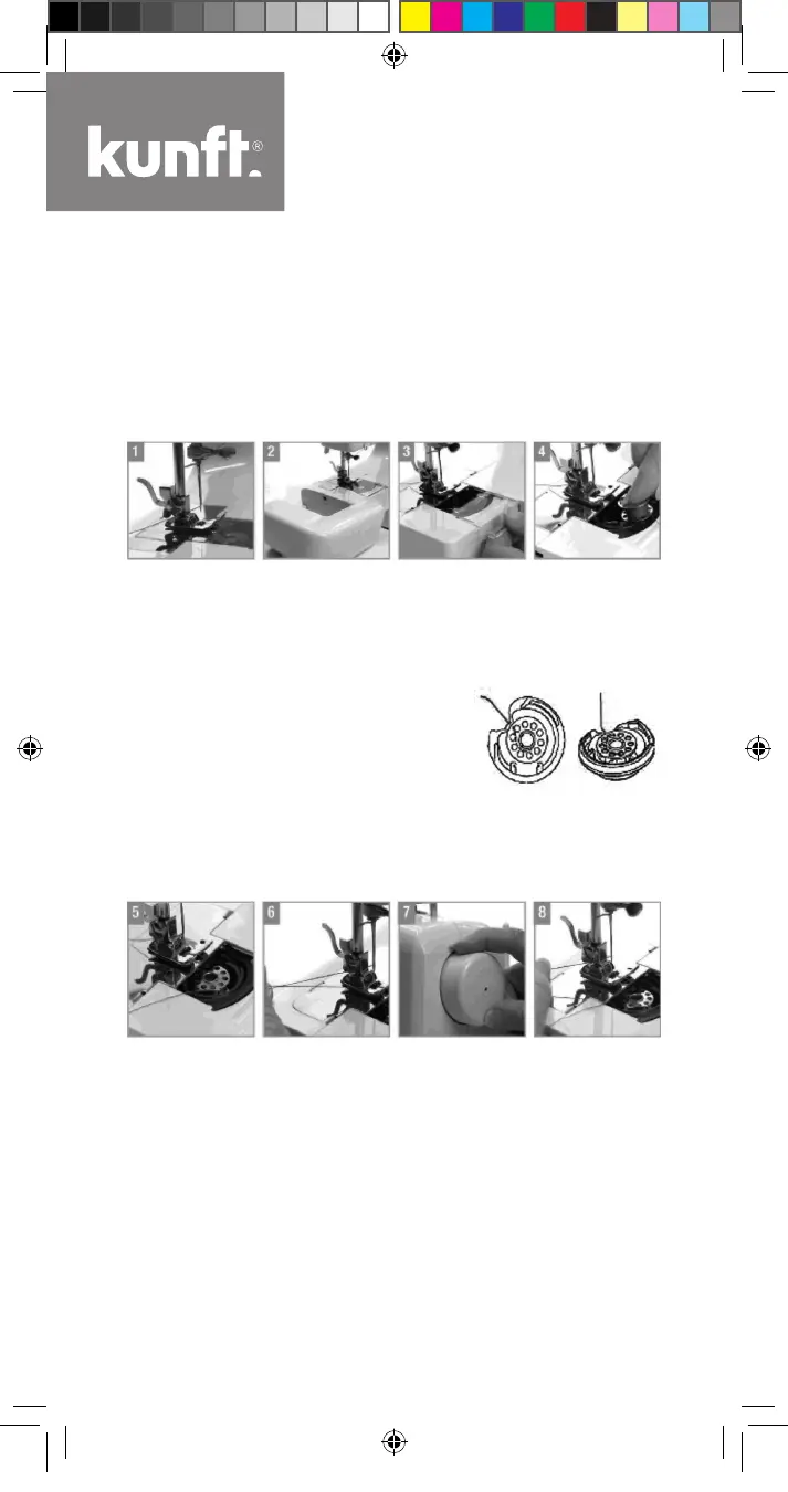 6. Coloque el hilo de la bobina y el hilo superior hacia la izquierda