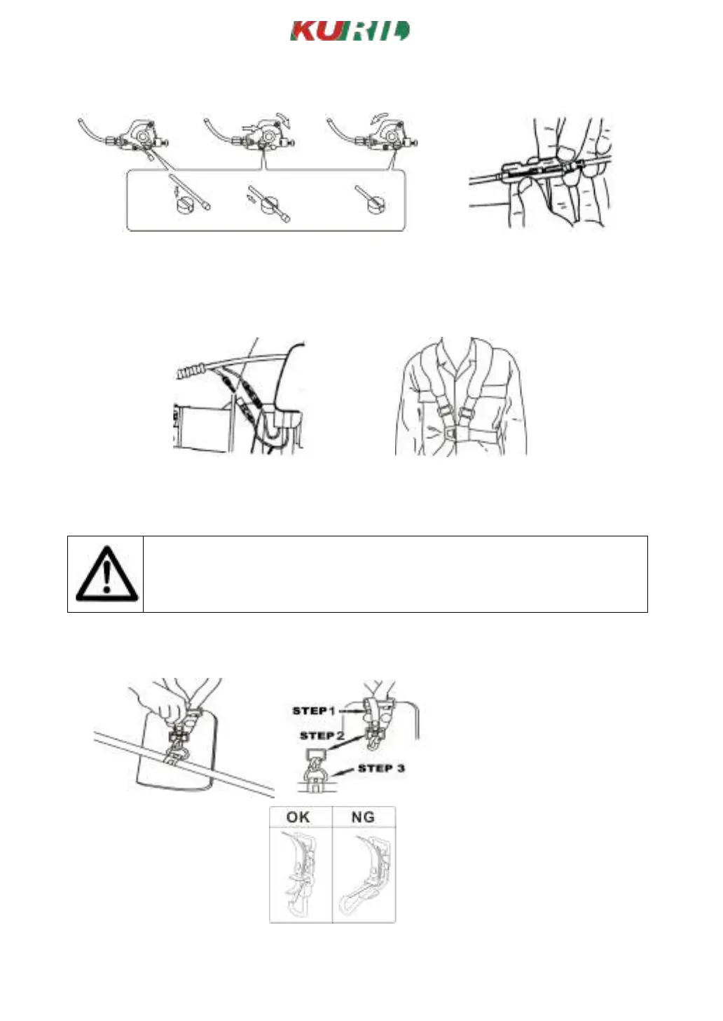 1. Tirez la poignée du harnais vers le haut pour séparer le crochet du harnais et libérer le harnais de l'outil de coupe.
