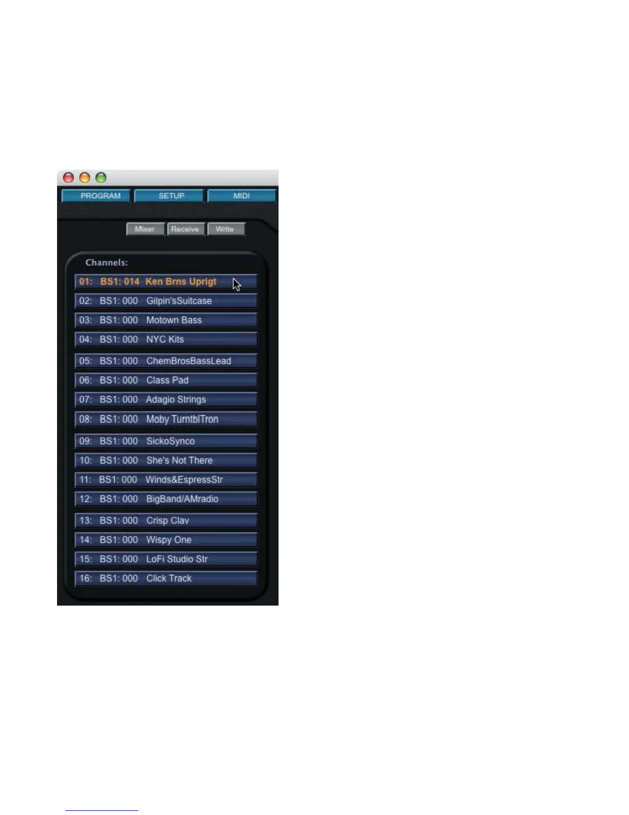 The MIDI Channel Display shows the PC3 Programs that are assigned to each of the sixteen