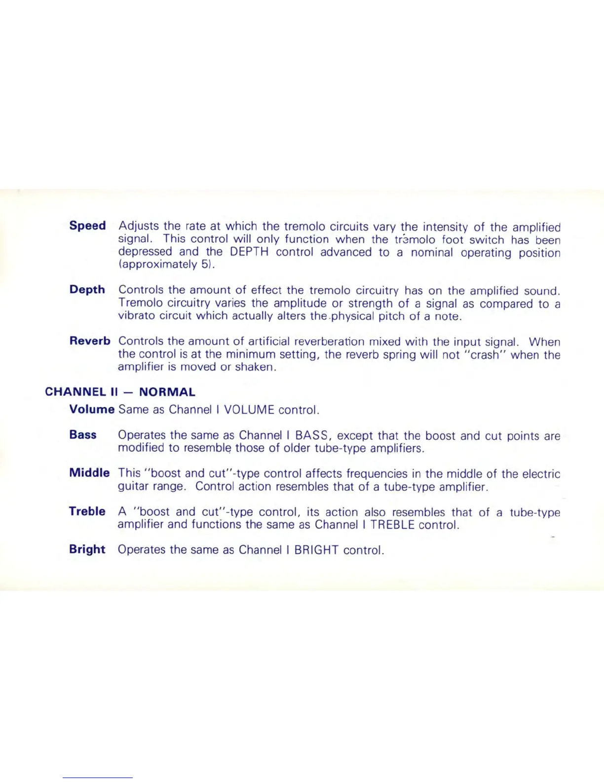 Speed Adjusts the rate at which the tremolo circuits vary the intensity