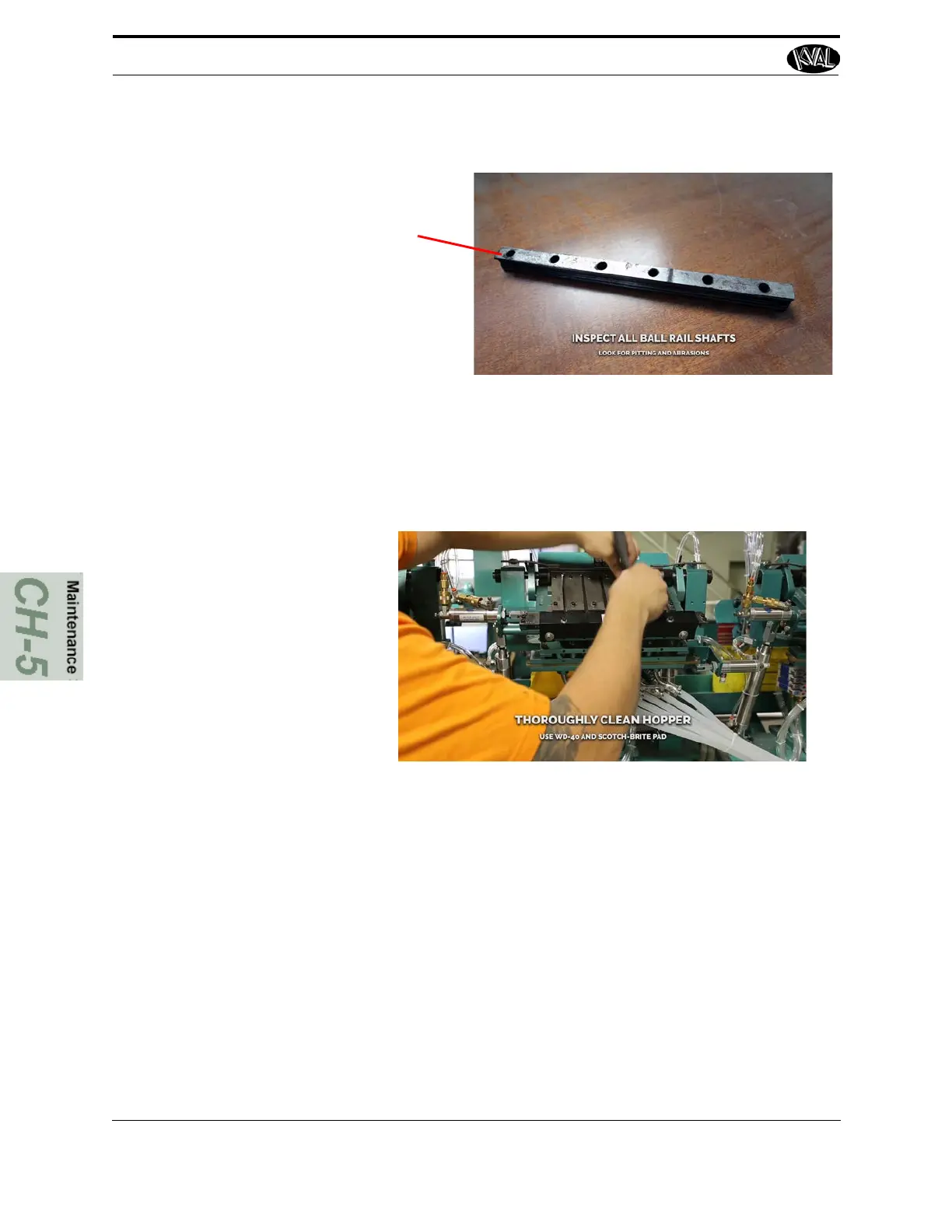 Inspect ball rail shafts for pitting or abrasions.