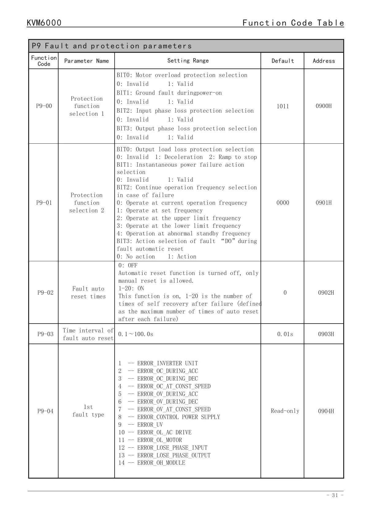 P9 Fault and protection parameters