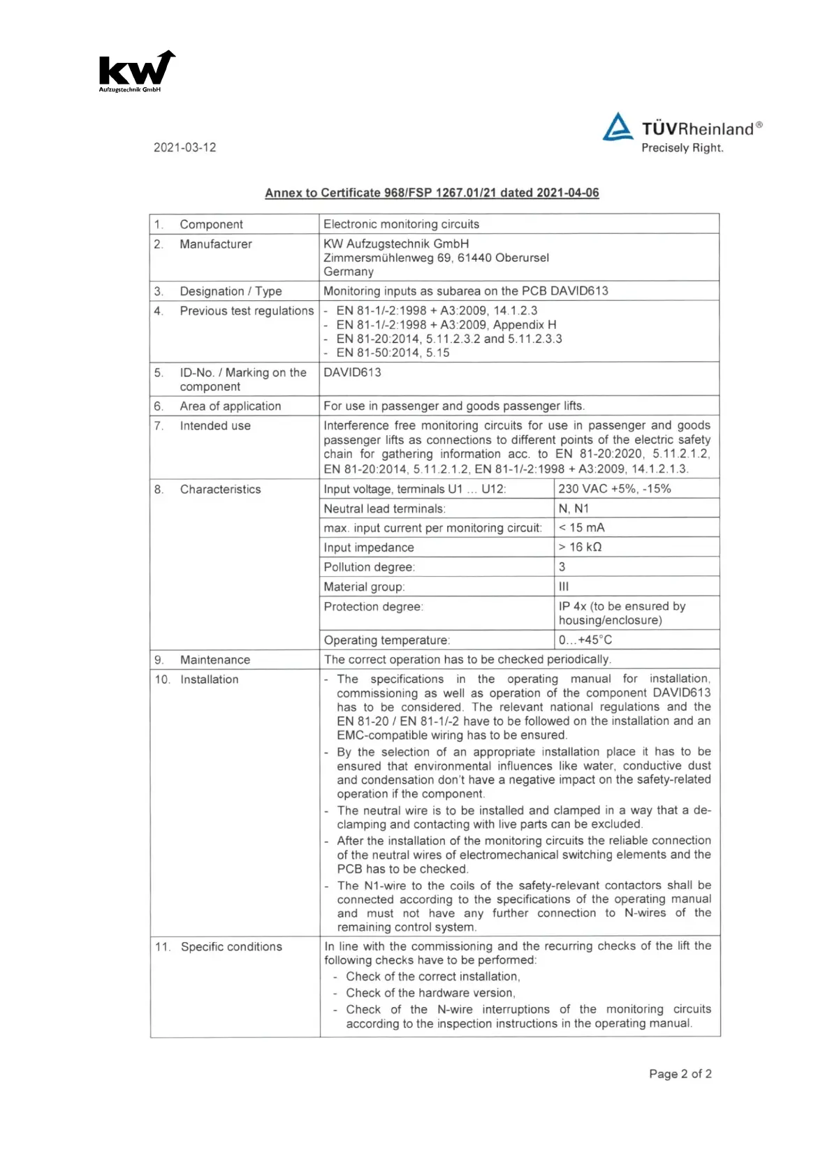 KW Aufzugstechnik GmbH OPERATING MANUAL DAVID-613