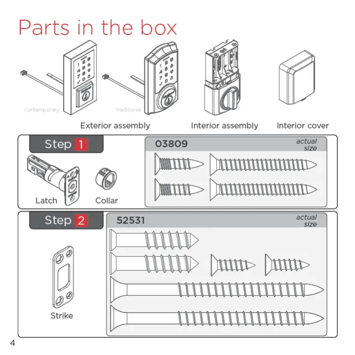 Kwikset SmartCode 9270CNT-514S - Parts in the box; Exterior assembly; Interior assembly; Interior cover