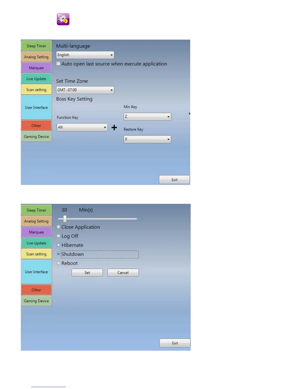 Sleep Timer: set the sleep timer for the system. You can make the system to close application, log off,