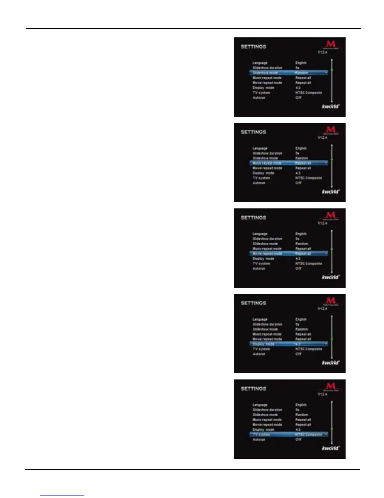 Slideshow Mode: “Random/Fading off/Off/Bottom To Top/