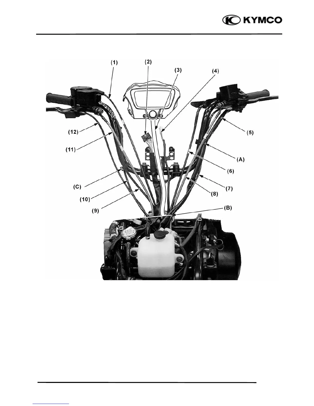 (B) Passe the throttle cable, chock cable, brake light switch wires, 2WD/4WD switch wire, front brake