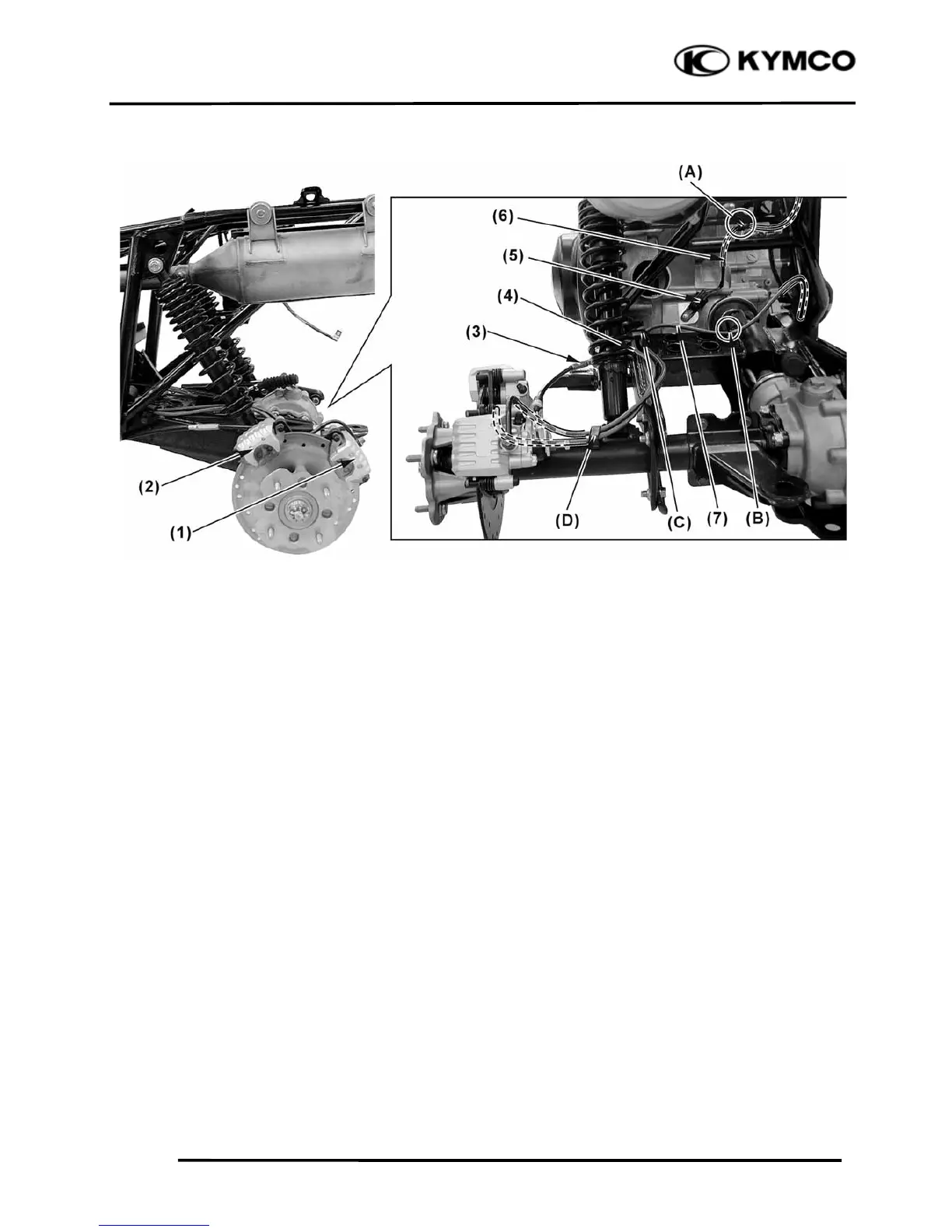 (3) Rear parking brake cable (ON ROAD) (7) Rear brake hose (Brake pedal)