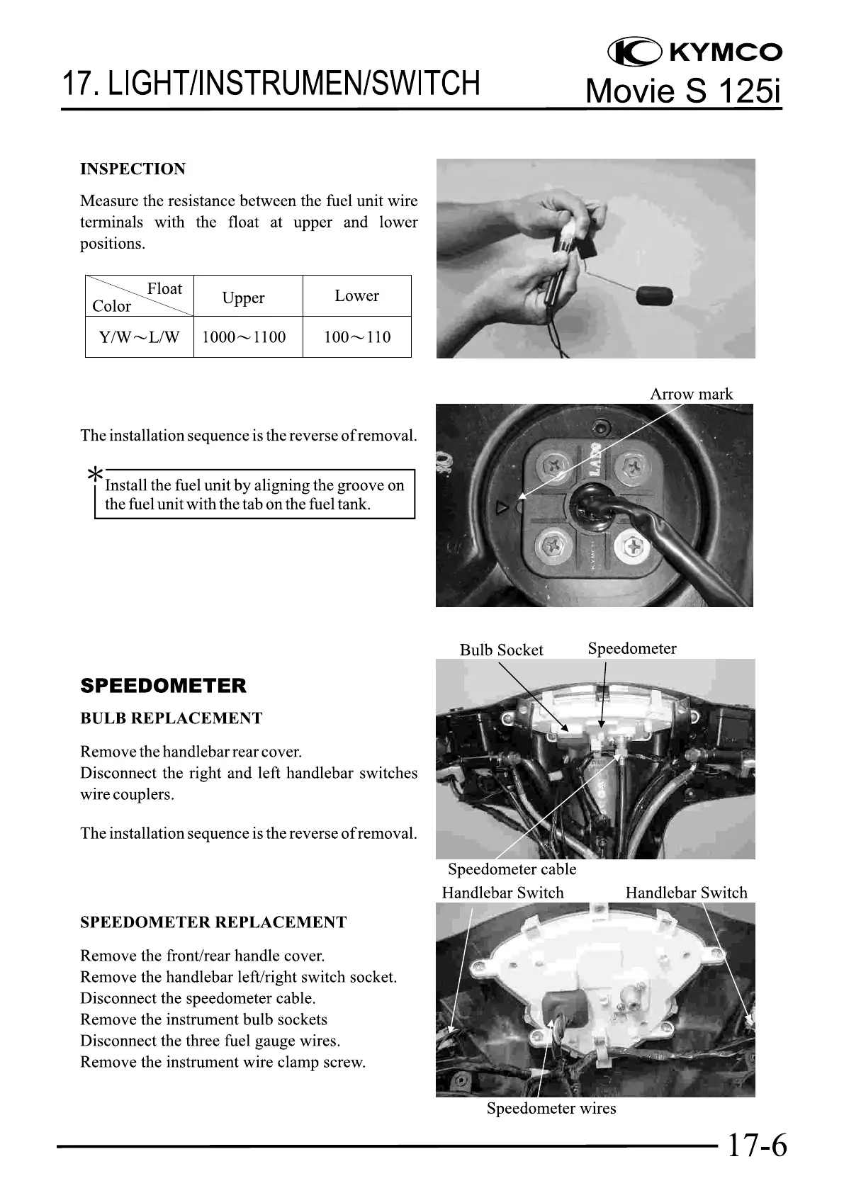 KYMCO SR25BA - Stop Switch, Horn, and Fuel Gauge Inspection; Fuel Unit Service Procedures