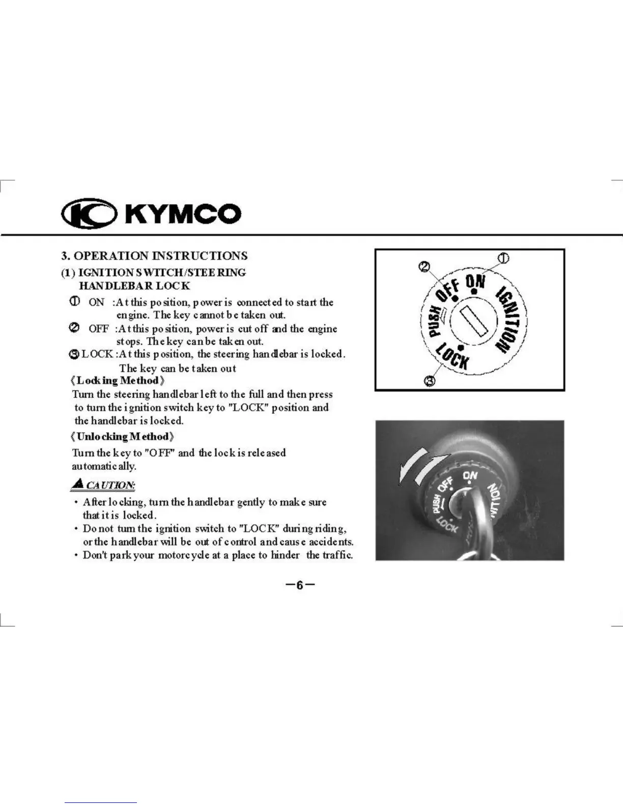 KYMCO Super 9 - KYMCO Motorcycle Operation Instructions; Ignition Switch and Steering Lock