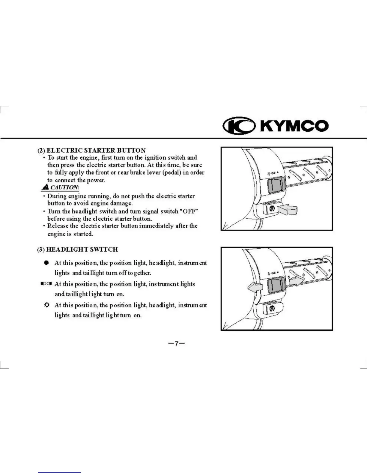 KYMCO Super 9 - Electric Starter Button Operation; Headlight Switch Functions
